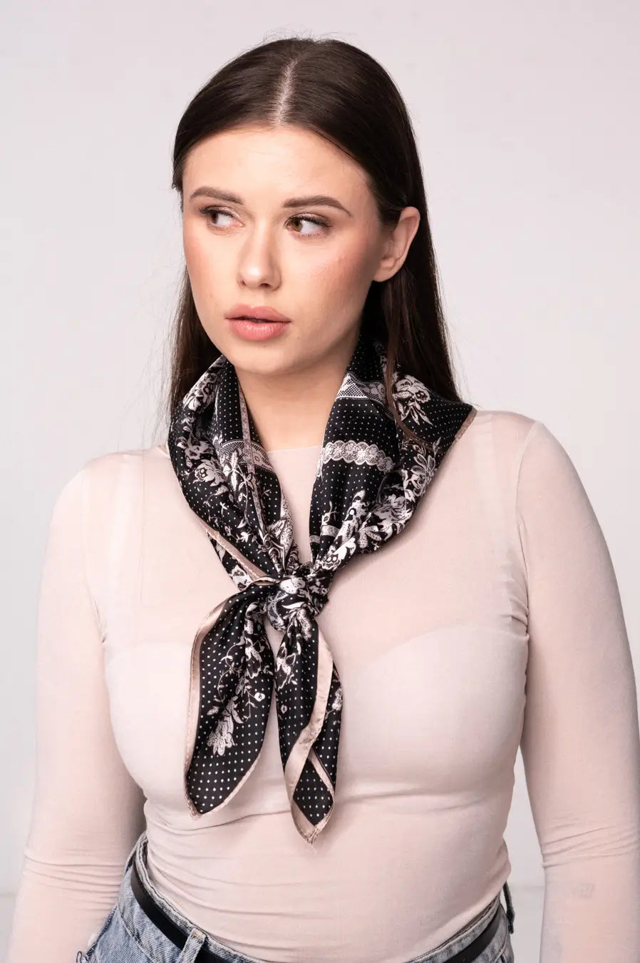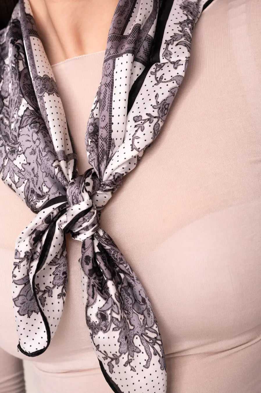Biała apaszka w czarne groszki i kwiaty łączy klasykę z subtelną nutą romantyzmu, sprawdzając się zarówno w casualowych, jak i bardziej eleganckich zestawieniach. To modny, praktyczny i ponadczasowy element garderoby, który podkreśla indywidualny styl.