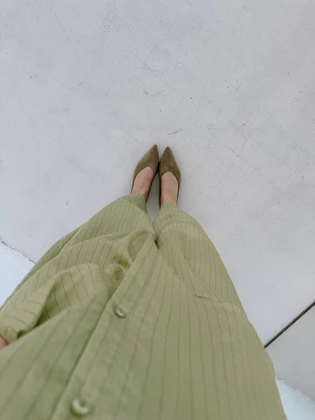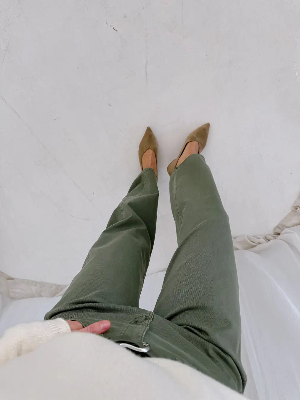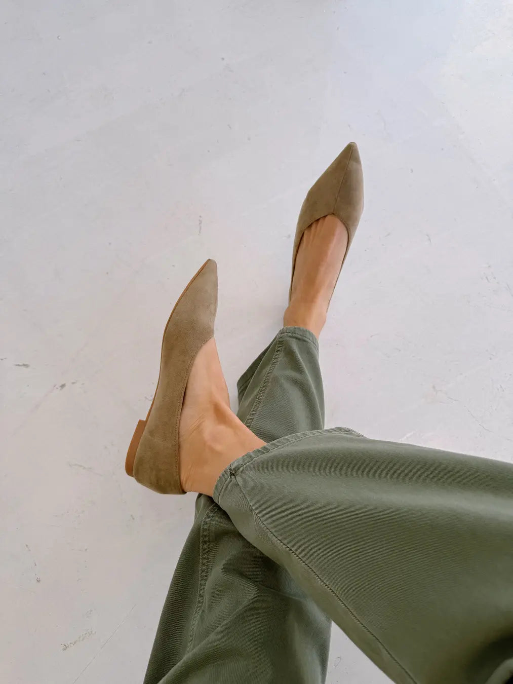 Eleganckie baleriny w kolorze matchy to idealne połączenie klasyki i nowoczesnego detalu. Smukły nosek w szpic z subtelnym przeszyciem optycznie wysmukla stopę, podkreśla linię buta i dodaje mu wyrafinowanego charakteru.
