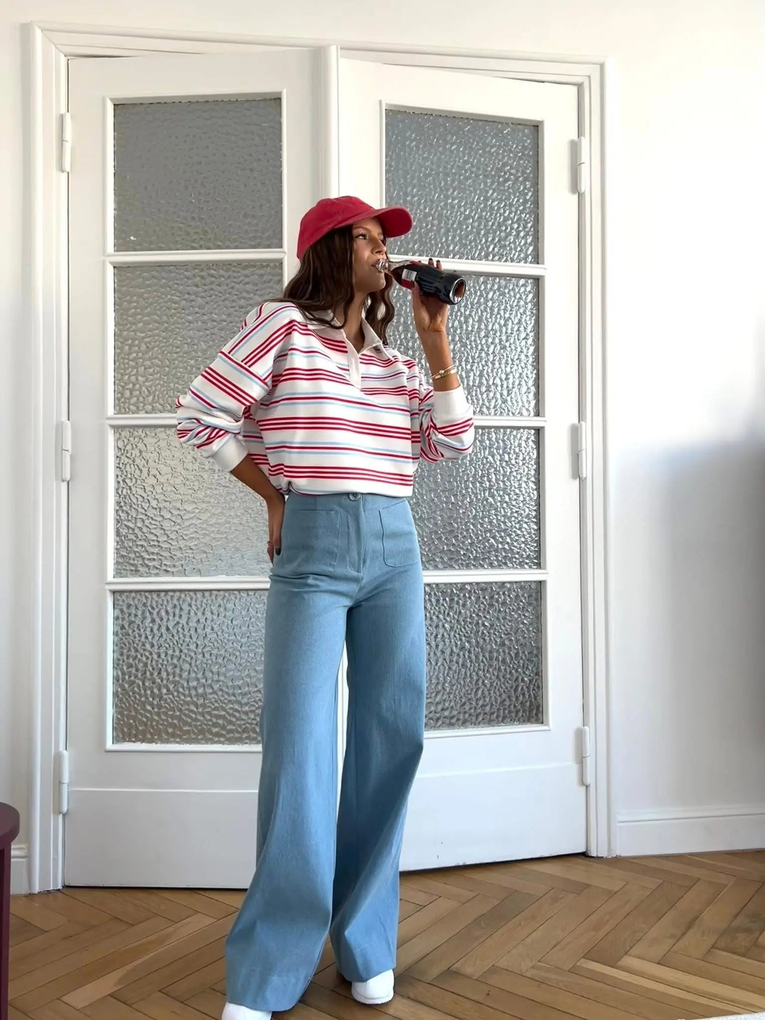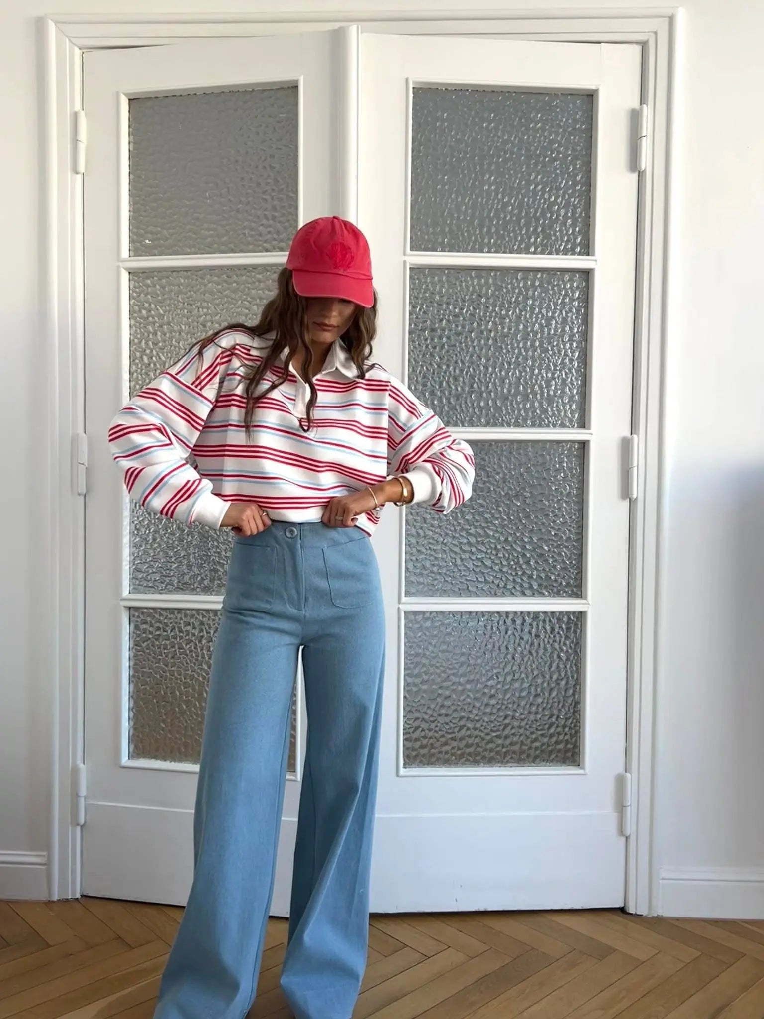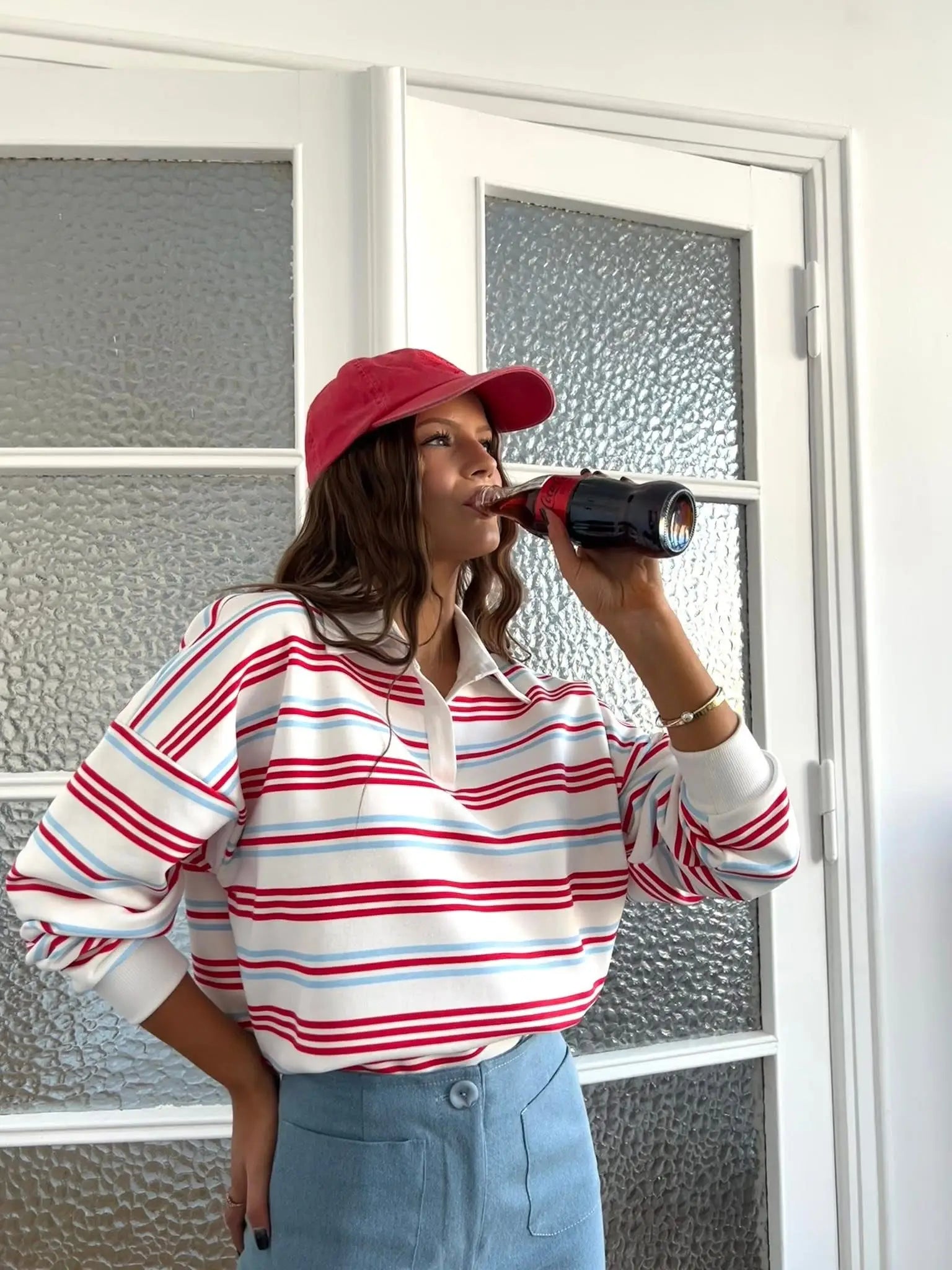 Bluza polo w czerwono-niebieski paski to stylowa i wygodna propozycja do codziennych stylizacji. Model o luźnym, swobodnym kroju zapewnia komfort noszenia i nadaje całości nowoczesny, casualowy charakter. Dekolt w kształcie litery V subtelnie podkreśla linię szyi i dodaje bluzie lekko sportowej elegancji.