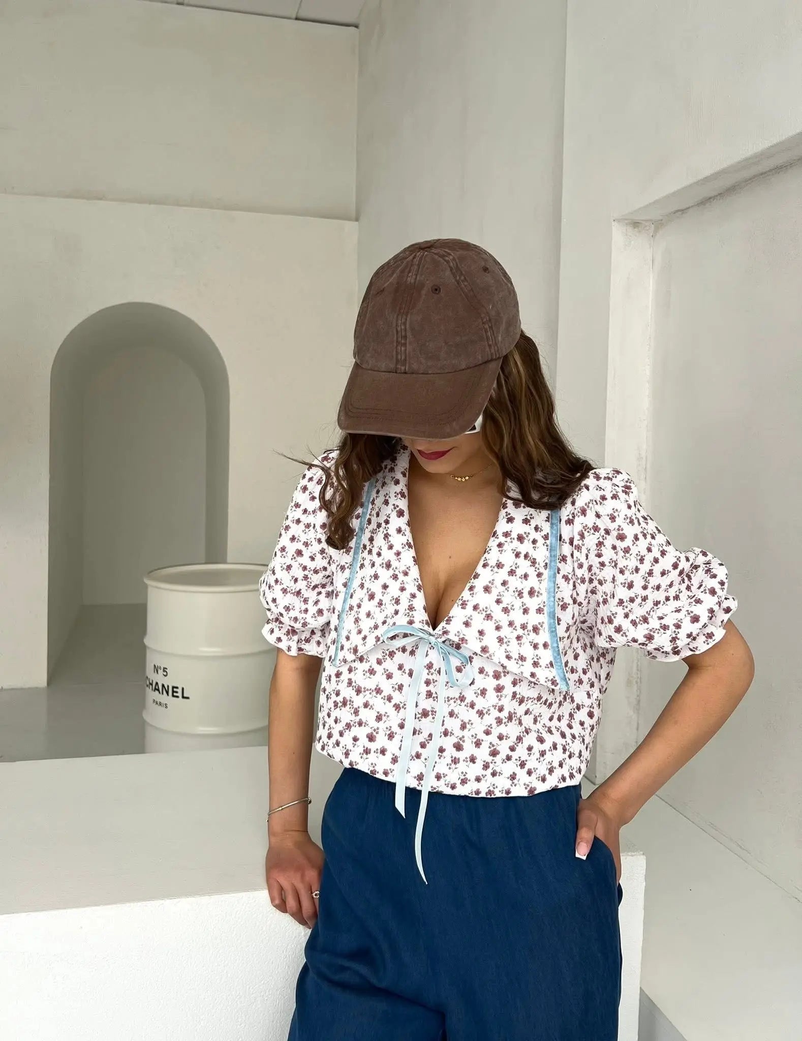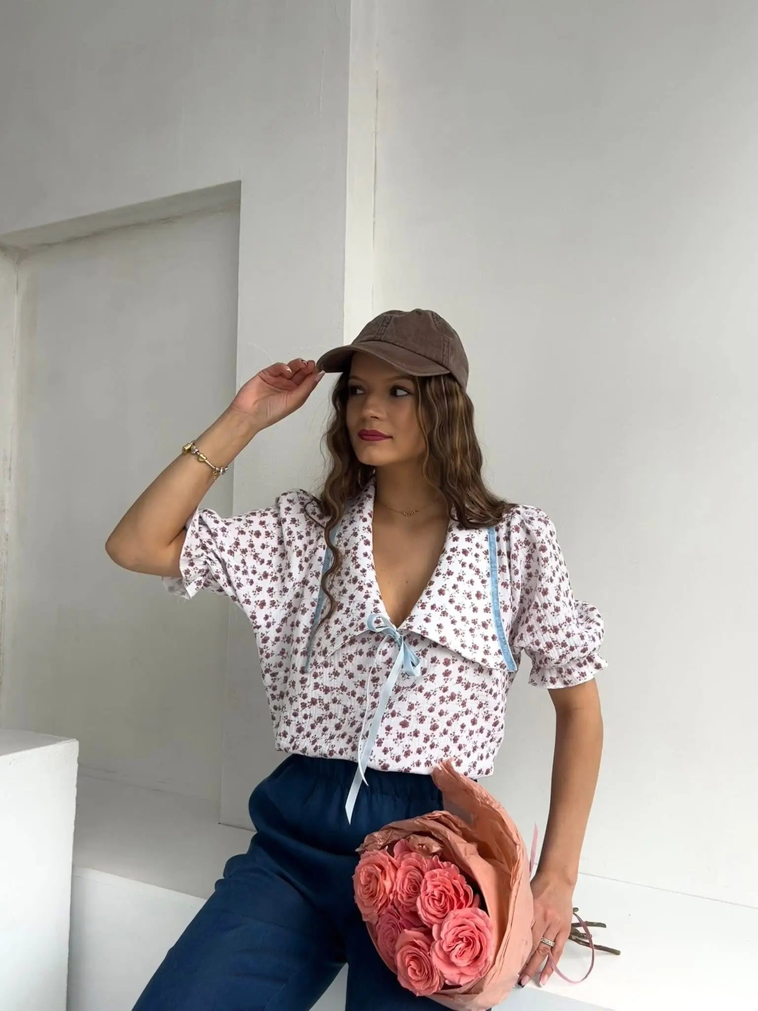 Bluzka posiada dekolt w kształcie litery V, podkreślony ozdobnym kołnierzem oraz kontrastową, jasnoniebieską lamówką, które dodają jej wyjątkowego charakteru. Krótkie, lekko bufiaste rękawy wprowadzają nutę romantyzmu i pięknie modelują ramiona.