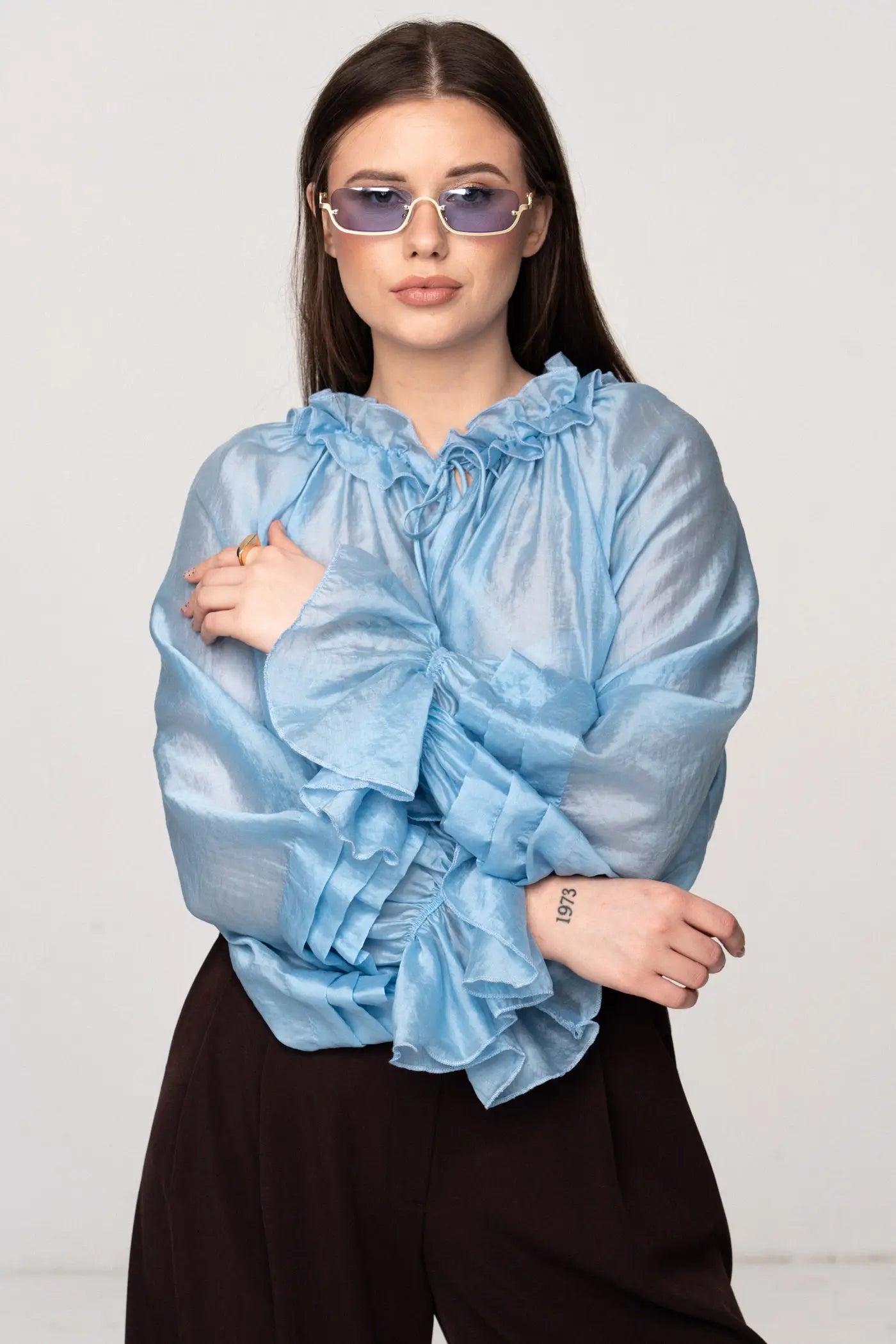 Falbanka przy szyi wprowadza kobiecy akcent, a bufiasty rękaw z zakładkami, zakończony gumką i falbanką, nadaje bluzce lekkości i modowego wyrazu. To połączenie elegancji i nowoczesnego designu sprawia, że bluzka doskonale sprawdzi się zarówno w codziennych stylizacjach, jak i w bardziej formalnych zestawach z marynarką czy spódnicą.