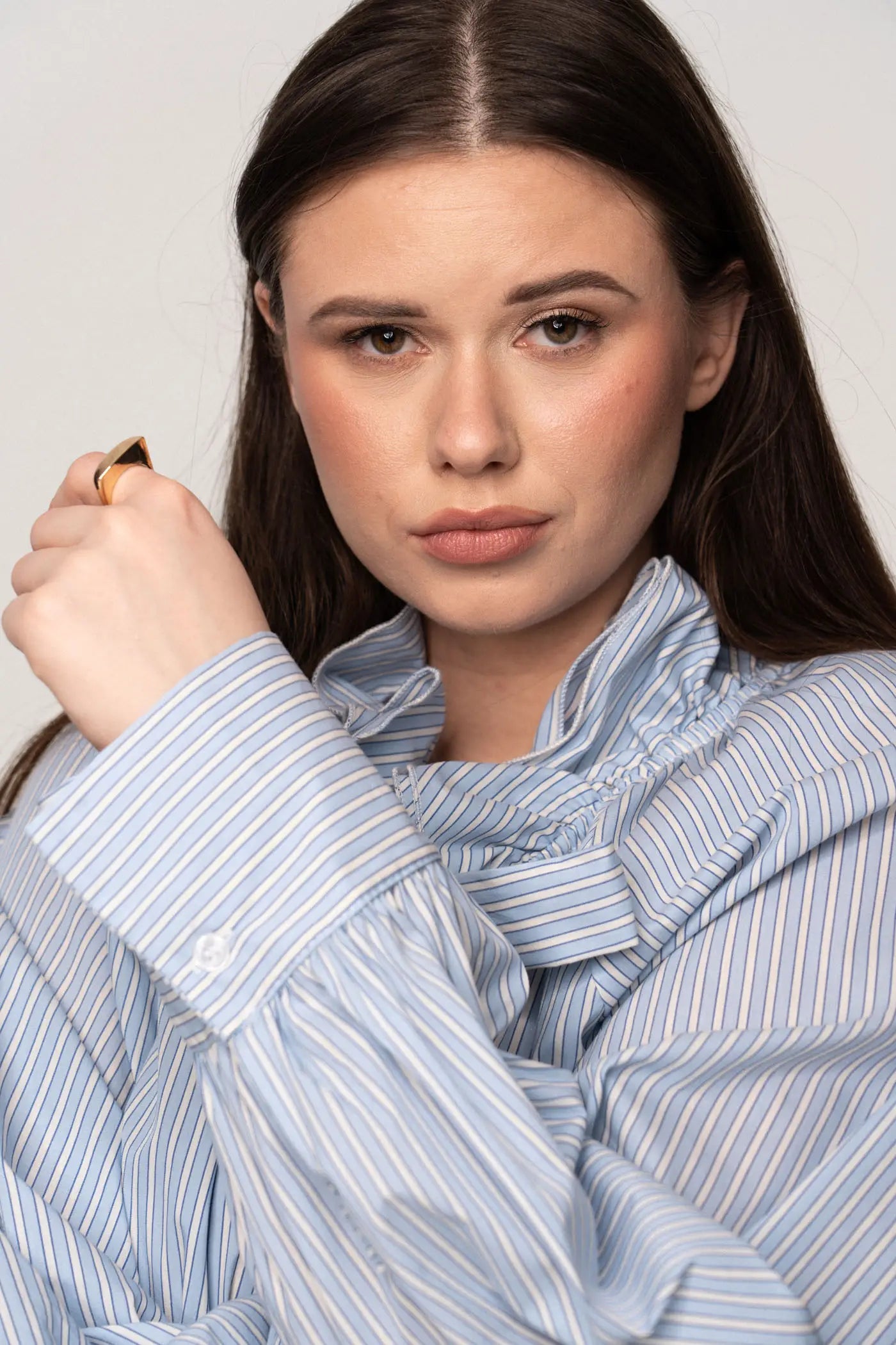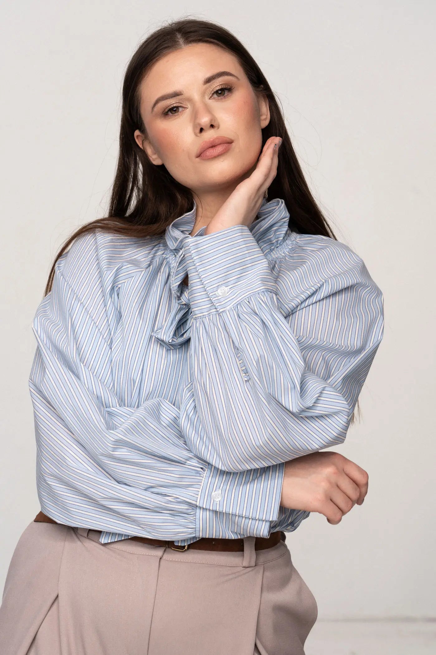 Bluzka koszulowa w biało-niebieskie paski to połączenie klasyki z nowoczesnym wydaniem. Oversize’owy fason nadaje jej nonszalanckiego charakteru i zapewnia pełną swobodę ruchów. Długi rękaw oraz dekoracyjna falbana przy szyi przełamują prostą formę, dodając całości subtelnej elegancji. Wiązanie pod szyją pozwala stylizować bluzkę na różne sposoby – od romantycznego po bardziej minimalistyczny. Idealna propozycja dla osób ceniących styl, wygodę i ponadczasowe wzory.