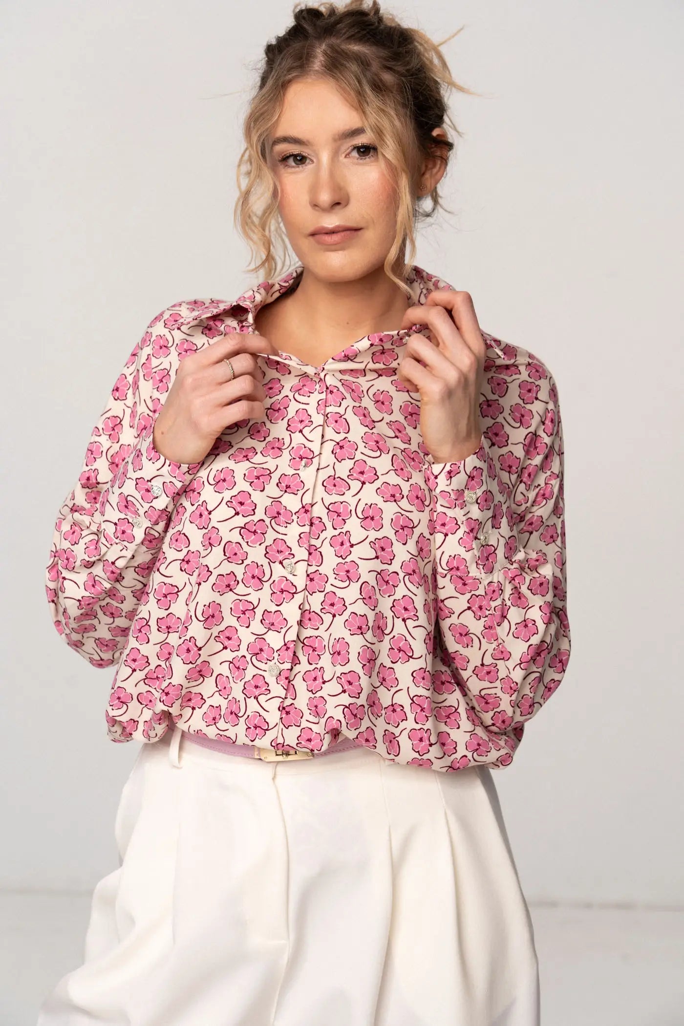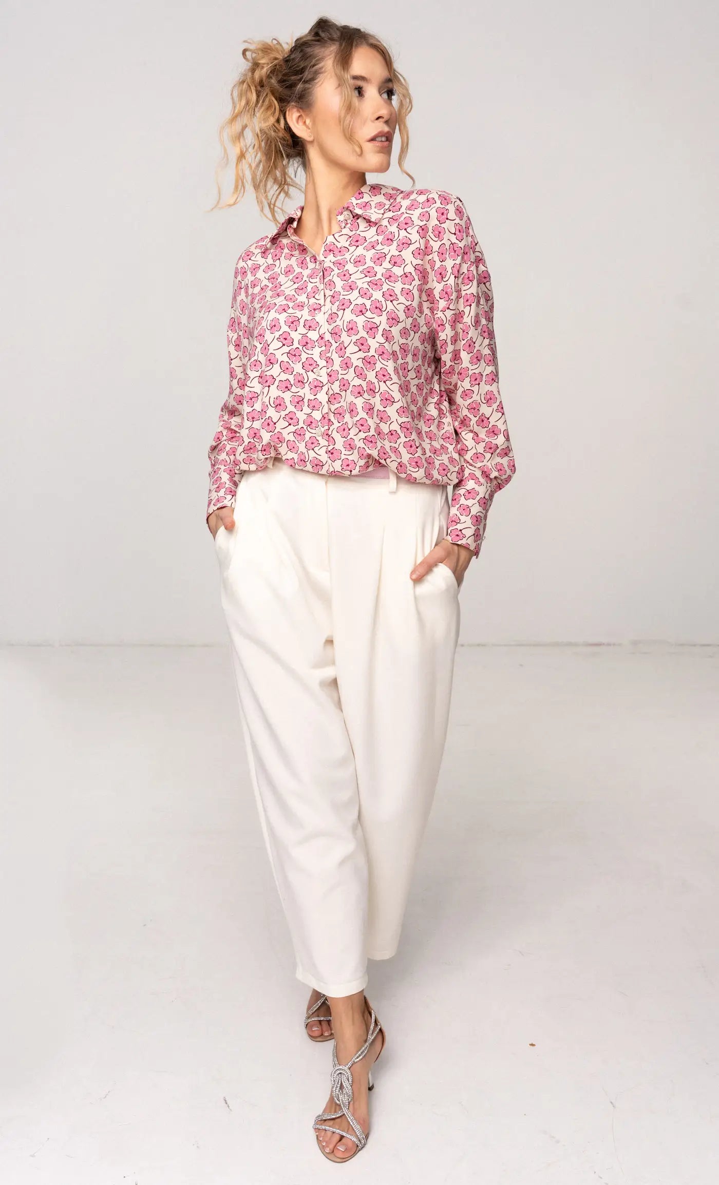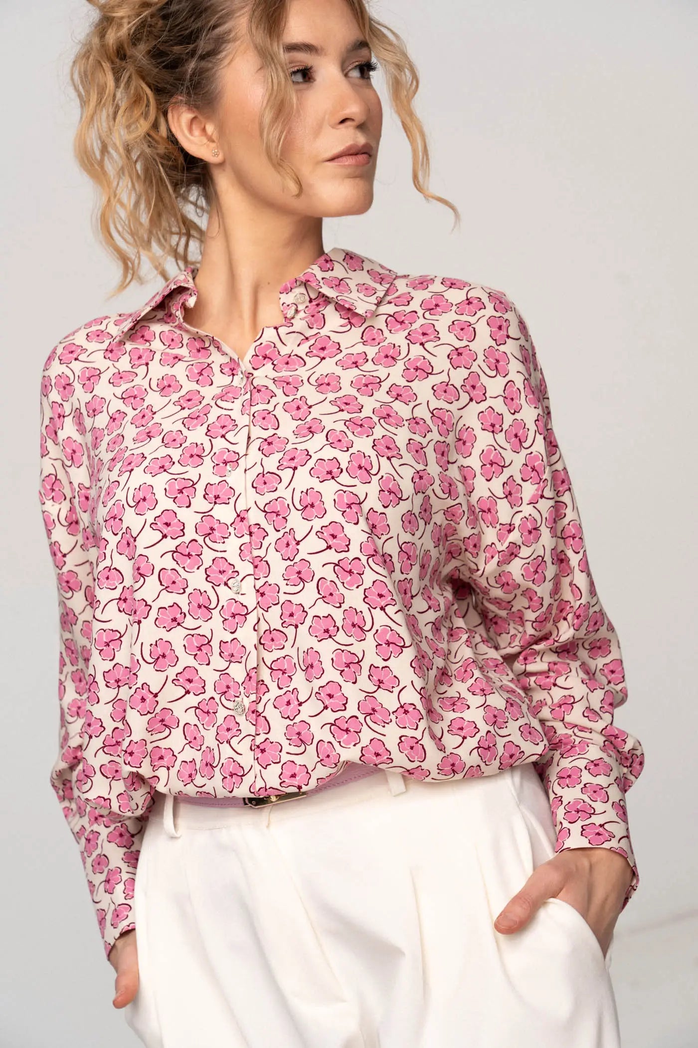 Koszula Simple w różowe kwiaty na beżowym tle to zwiewna i kobieca propozycja, która łączy komfort z subtelnym, romantycznym wzorem. Wykonana z miękkiej, lekkiej wiskozy, zapewnia przyjemne uczucie noszenia. Model zapinany jest na drobne guziki z przodu, co nadaje klasycznego charakteru, a tylny karczek dodaje konstrukcyjnej elegancji i lekkości sylwetce. Szersze mankiety oraz obniżona linia ramienia tworzą luźny, oversize’owy fason, który podkreśla swobodny styl koszuli. To idealny wybór do codziennych, casualowych stylizacji, ale świetnie sprawdzi się także w bardziej wyrafinowanych zestawach, dodając im świeżości i delikatnego uroku.