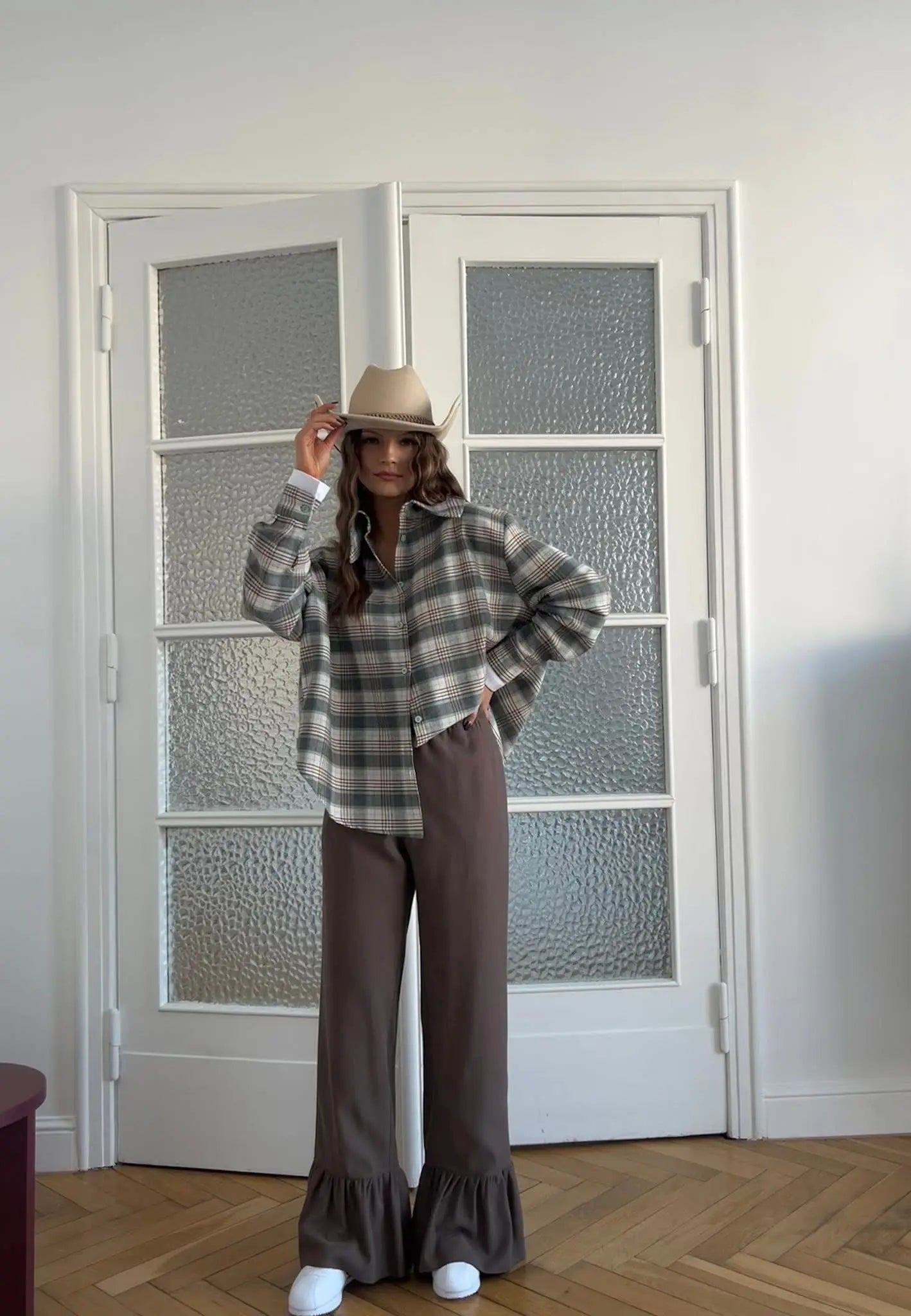 Model wyróżnia się kontrastowym białym mankietem, który dodaje koszuli elegancji i subtelnie przełamuje kraciasty wzór. Starannie dobrana kolorystyka sprawia, że koszula jest uniwersalna i łatwa do stylizacji – doskonale komponuje się zarówno z jeansami jak i spódnicą.