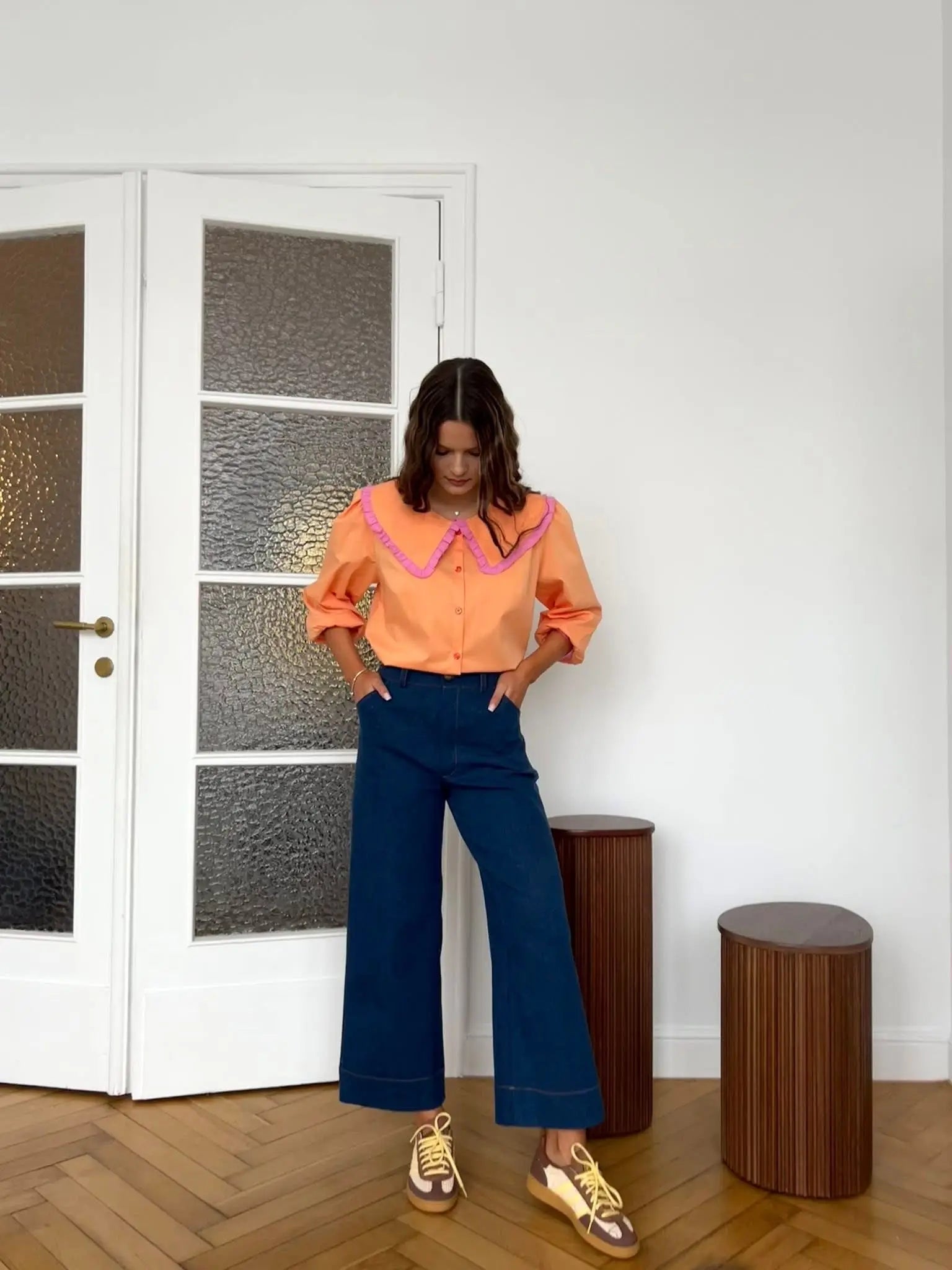 Dodaj swojej stylizacji odrobinę świeżości i kobiecego uroku. Ta wyjątkowa koszula w ciepłym, brzoskwiniowym odcieniu przyciąga wzrok efektownym, szerokim kołnierzem wykończonym kontrastową, różową falbanką. To połączenie klasyki z modowym twistem, które idealnie sprawdzi się zarówno w codziennych, jak i bardziej eleganckich stylizacjach.