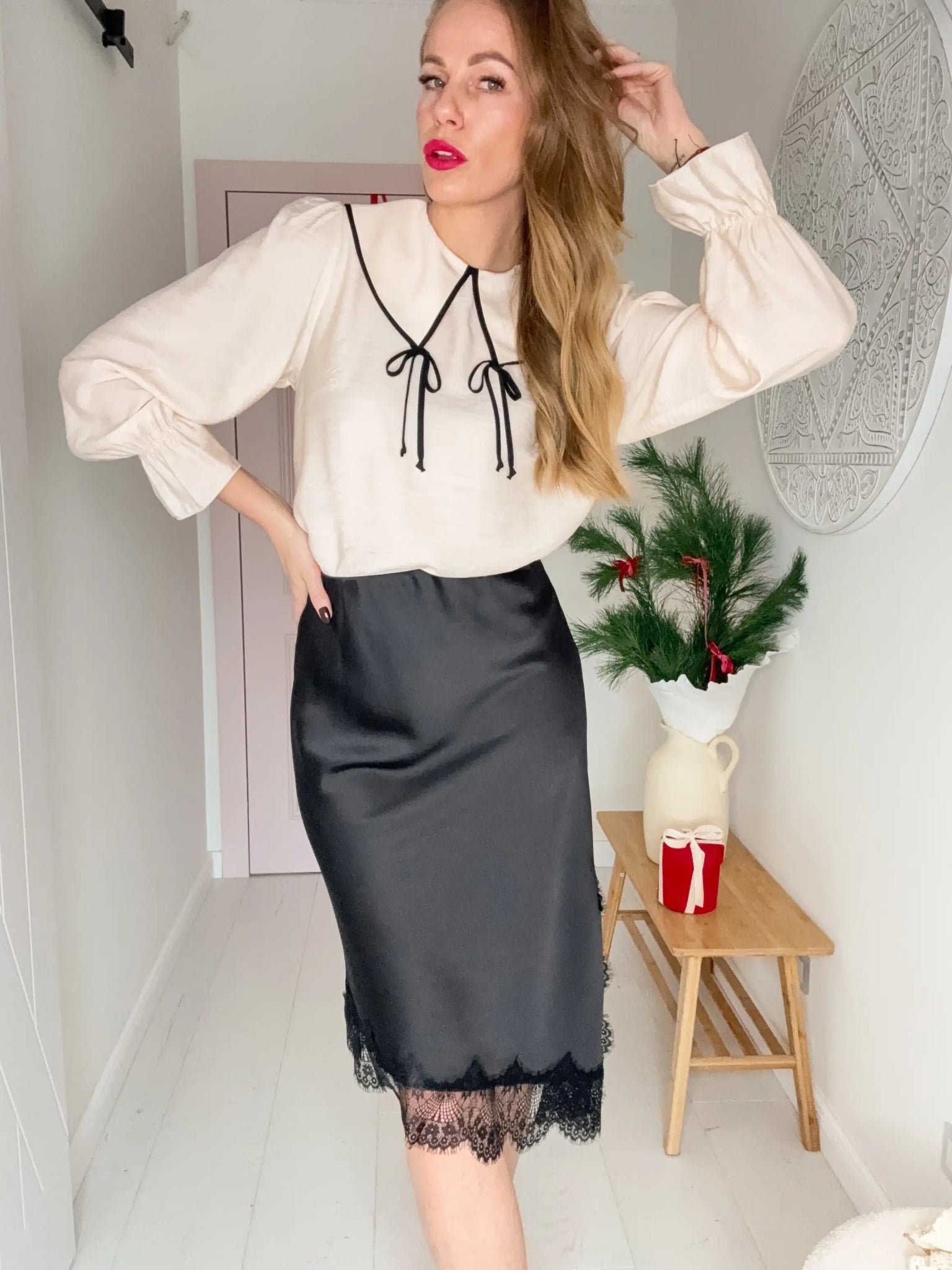 Asymetryczna satynowa spódnica Tiffany z efektownym rozcięciem na udzie, ozdobionym delikatną koronką. Wykonana z materiału, który miękko układa się na sylwetce, podkreślając jej kobiecy kształt. Asymetryczny krój nadaje całości nowoczesnego, zmysłowego charakteru. To idealne połączenie elegancji i subtelnego pazura.