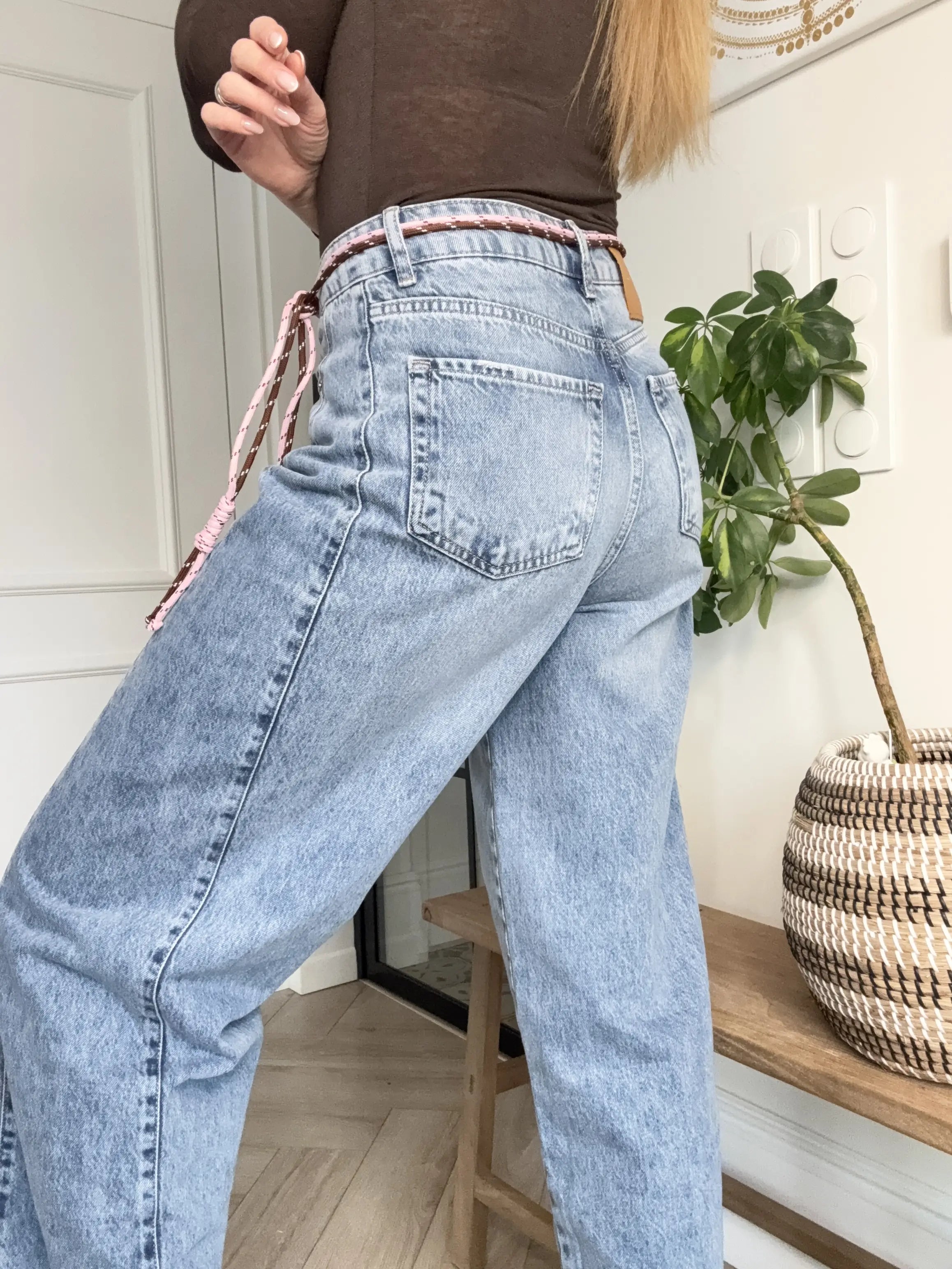 Niebieskie spodnie dżinsowe o szerokiej, prostej i długiej nogawce to nowoczesna interpretacja klasycznego denimu. Wysoki stan pięknie podkreśla talię i zapewnia komfort noszenia, a boczne przeszycie wydłuża optycznie sylwetkę i nadaje całości wyrazisty, designerski charakter. Kontrastujący różowy sznurek w pasie wprowadza subtelny akcent koloru i przełamuje klasyczny wygląd jeansów, dodając im świeżości i lekkości. Model łączy swobodę z dopracowanym detalem - idealny do codziennych i bardziej stylowych zestawów.