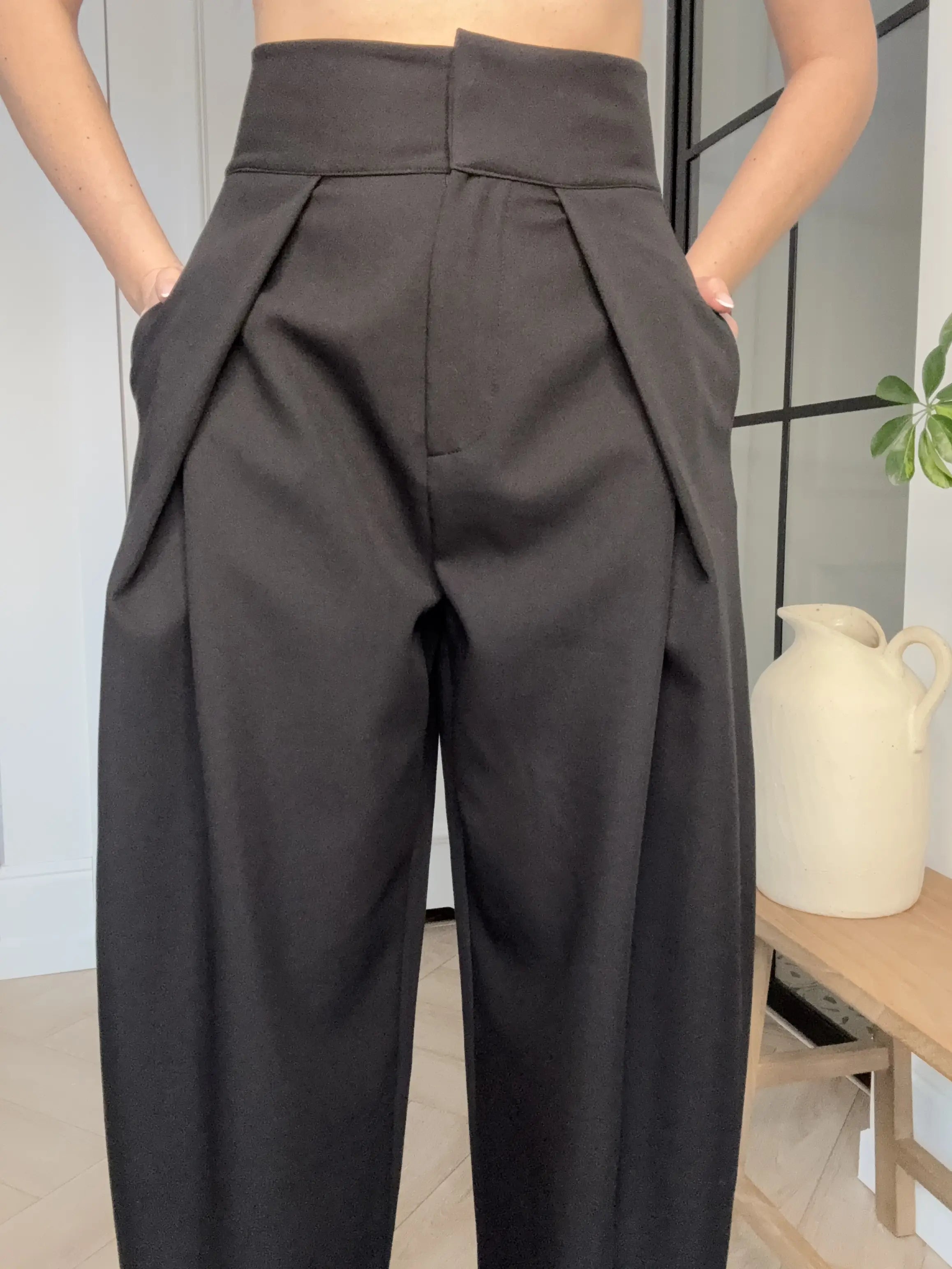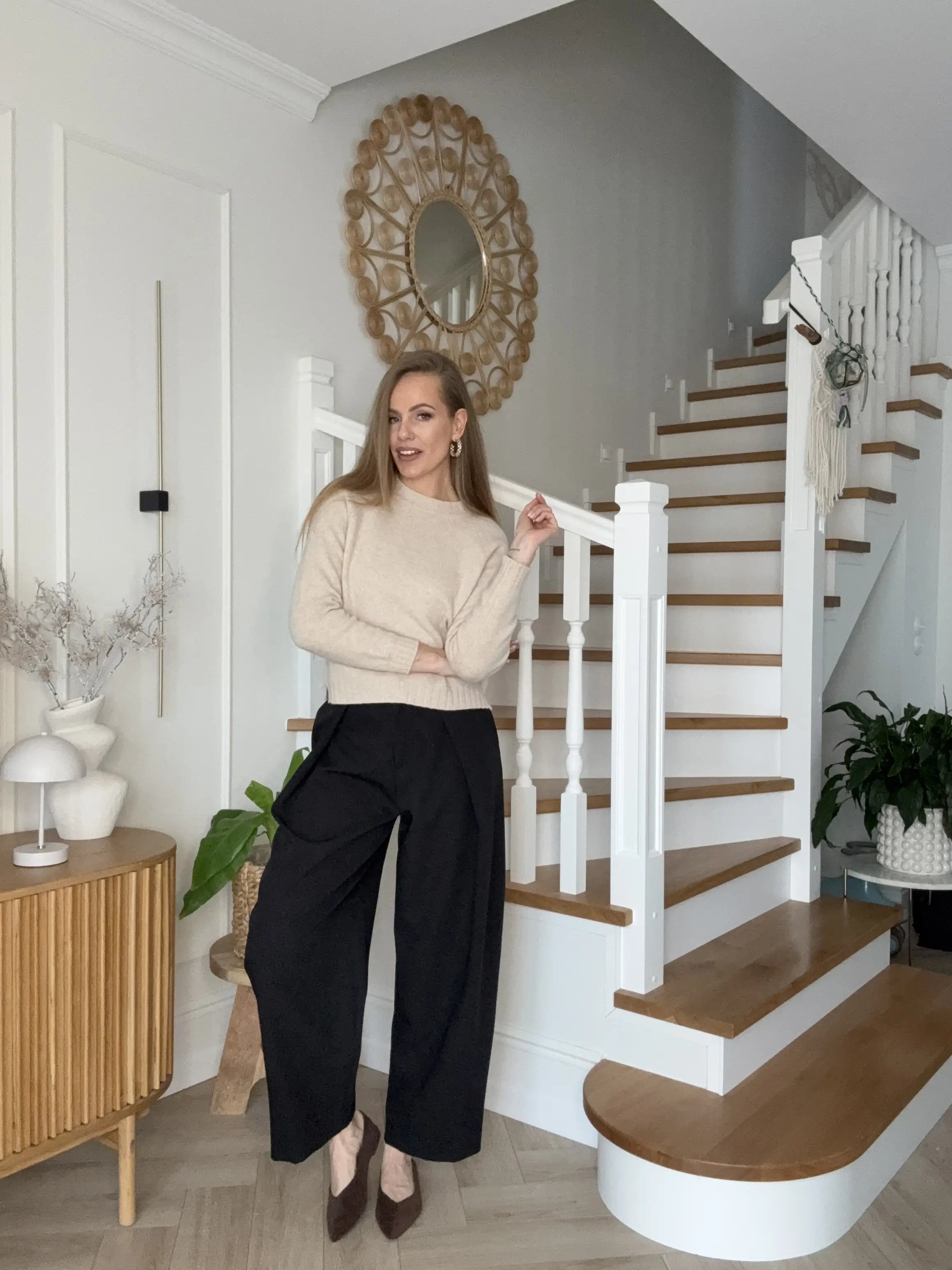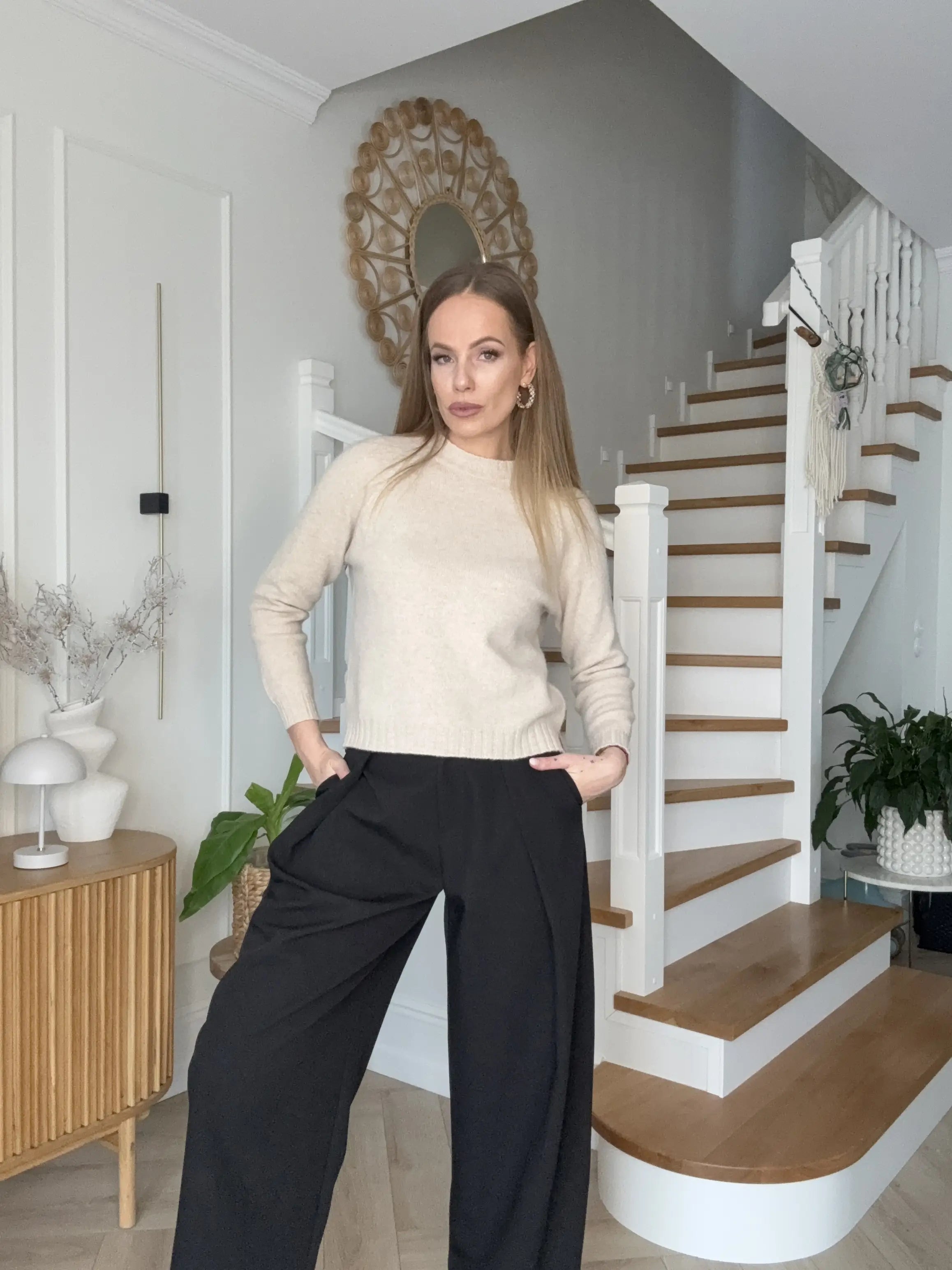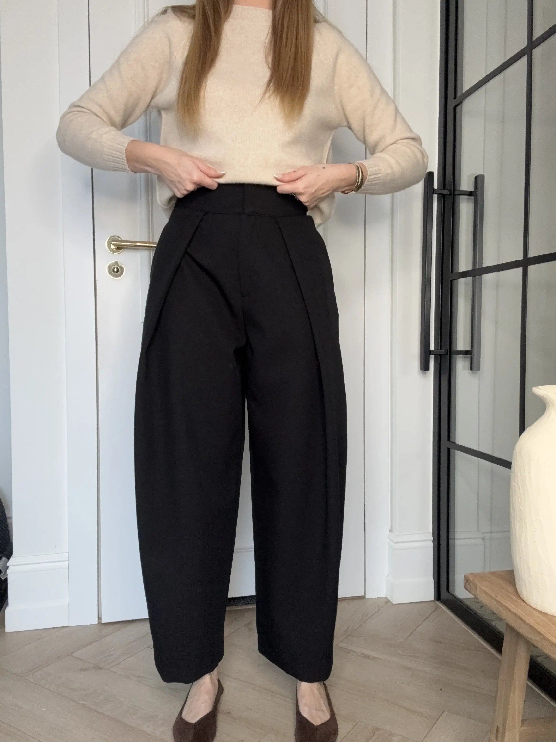Czarne spodnie materiałowe Theo to elegancka i ponadczasowa propozycja do wielu stylizacji. Model z szeroką nogawką zapewnia swobodę ruchów i nowoczesny wygląd. Zakładki z przodu subtelnie podkreślają biodra, a wpuszczane kieszenie dodają całości funkcjonalności, nie zaburzając estetycznej linii fasonu. Spodnie posiadają szeroki pas w talii, który ładnie ją podkreśla i zwiększa komfort noszenia. Zapięcie na zamek oraz haftki gwarantuje stabilne i wygodne dopasowanie. Neutralny kolor sprawia, że spodnie doskonale sprawdzą się zarówno w eleganckich, jak i codziennych stylizacjach.