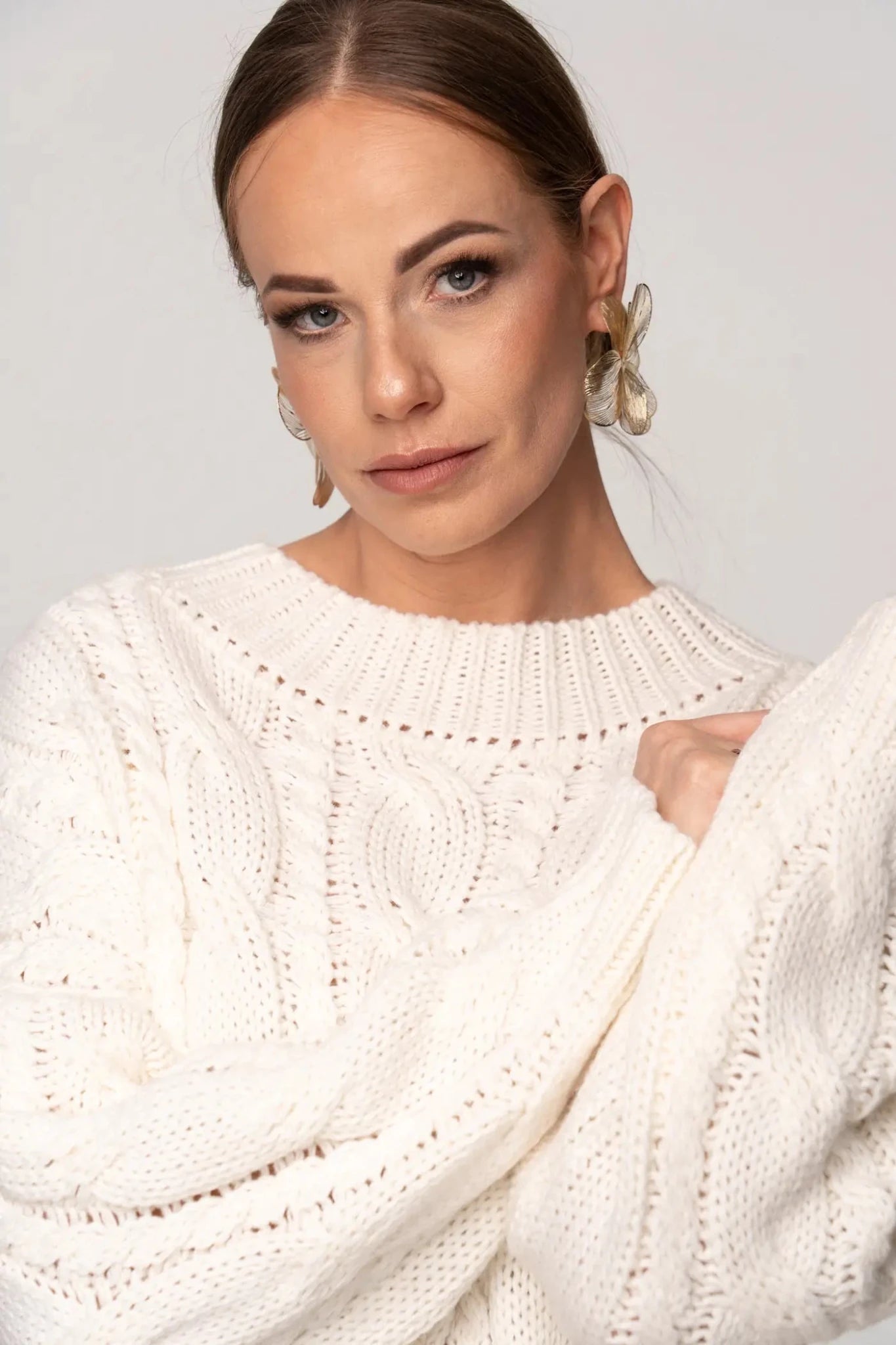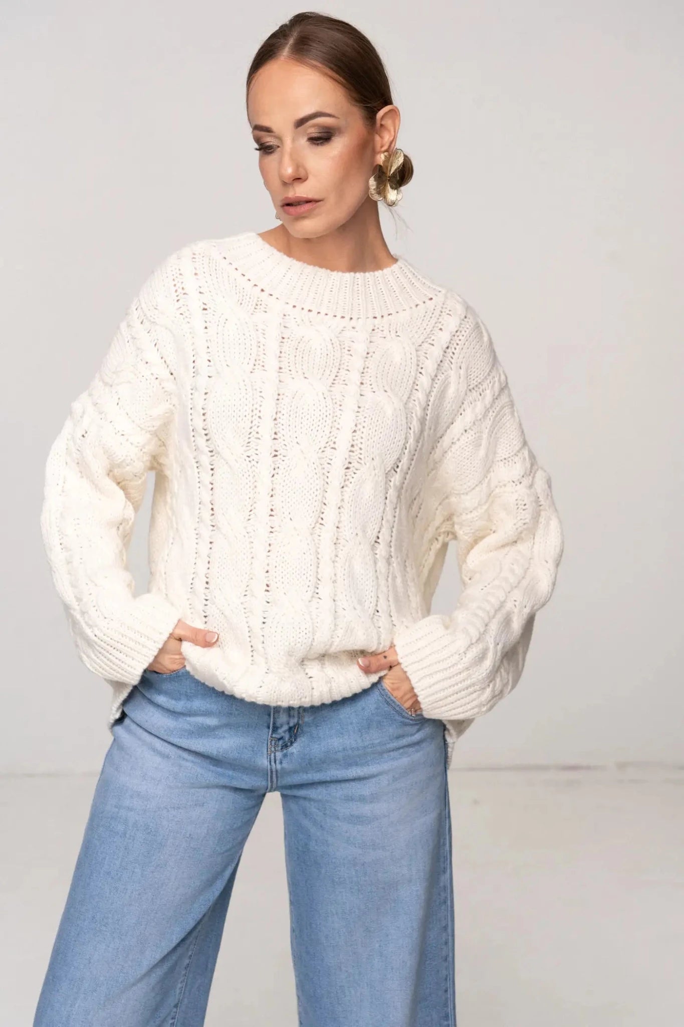 Zanurz się w miękkości i komforcie naszego kremowego swetra Aura z grubym, warkoczowym splotem. Wykonany z wysokiej jakości mieszanki wełny i alpaki, dzięki czemu jest wyjątkowo miękki, lekki i przyjemny w dotyku. Naturalne włókna zapewniają doskonałą izolację cieplną, jednocześnie pozwalając skórze oddychać.