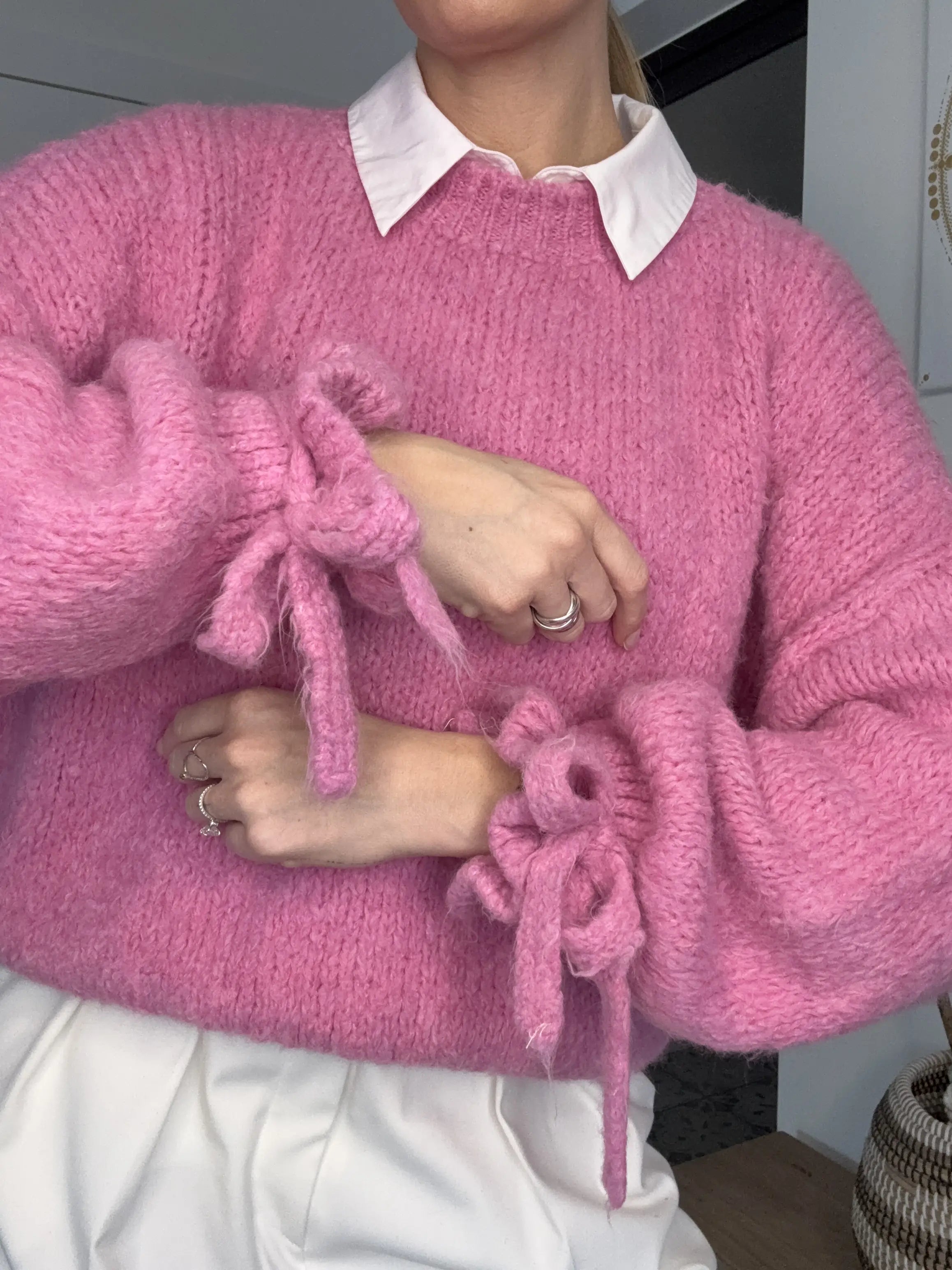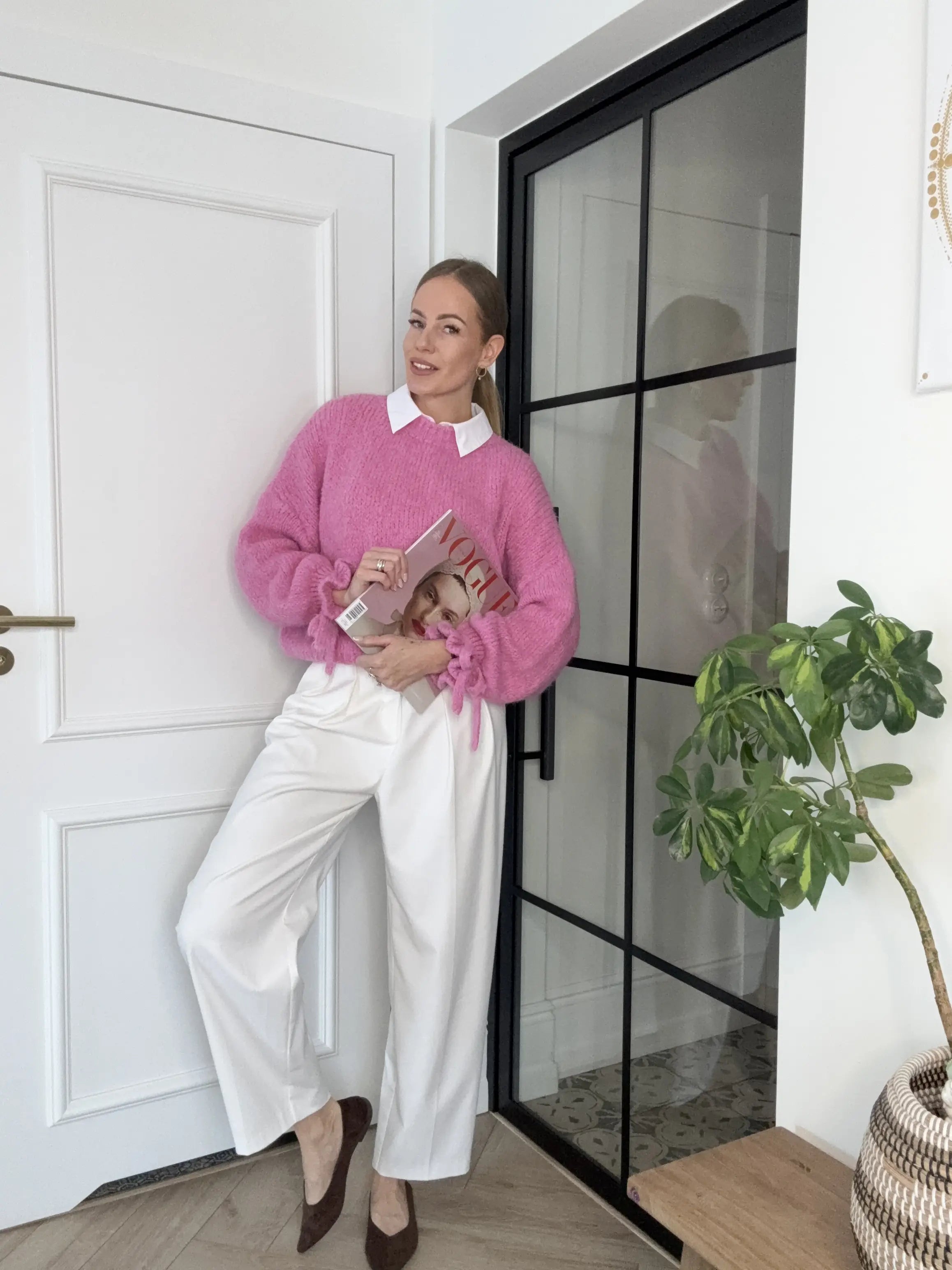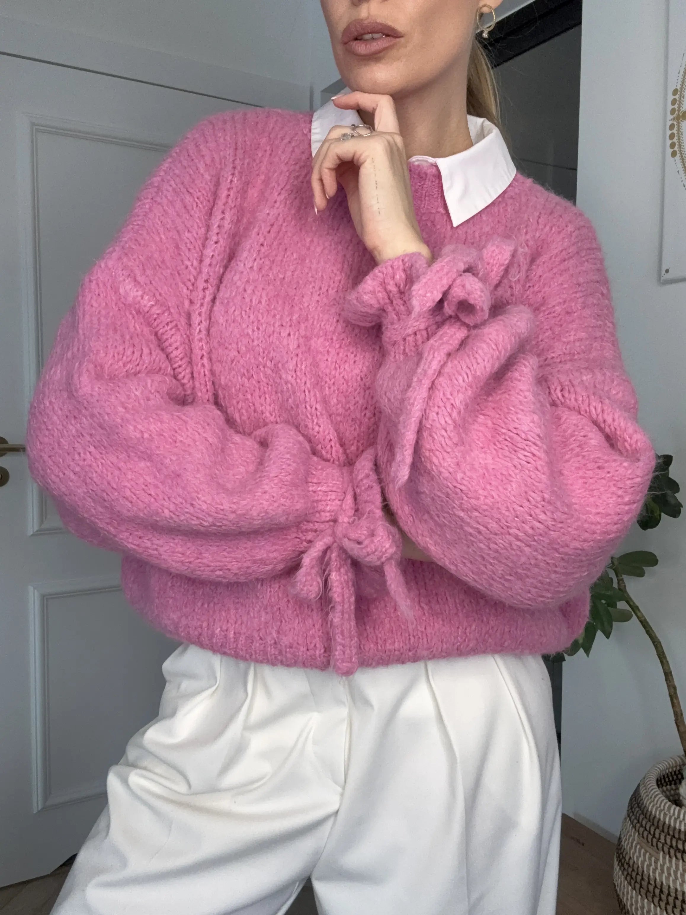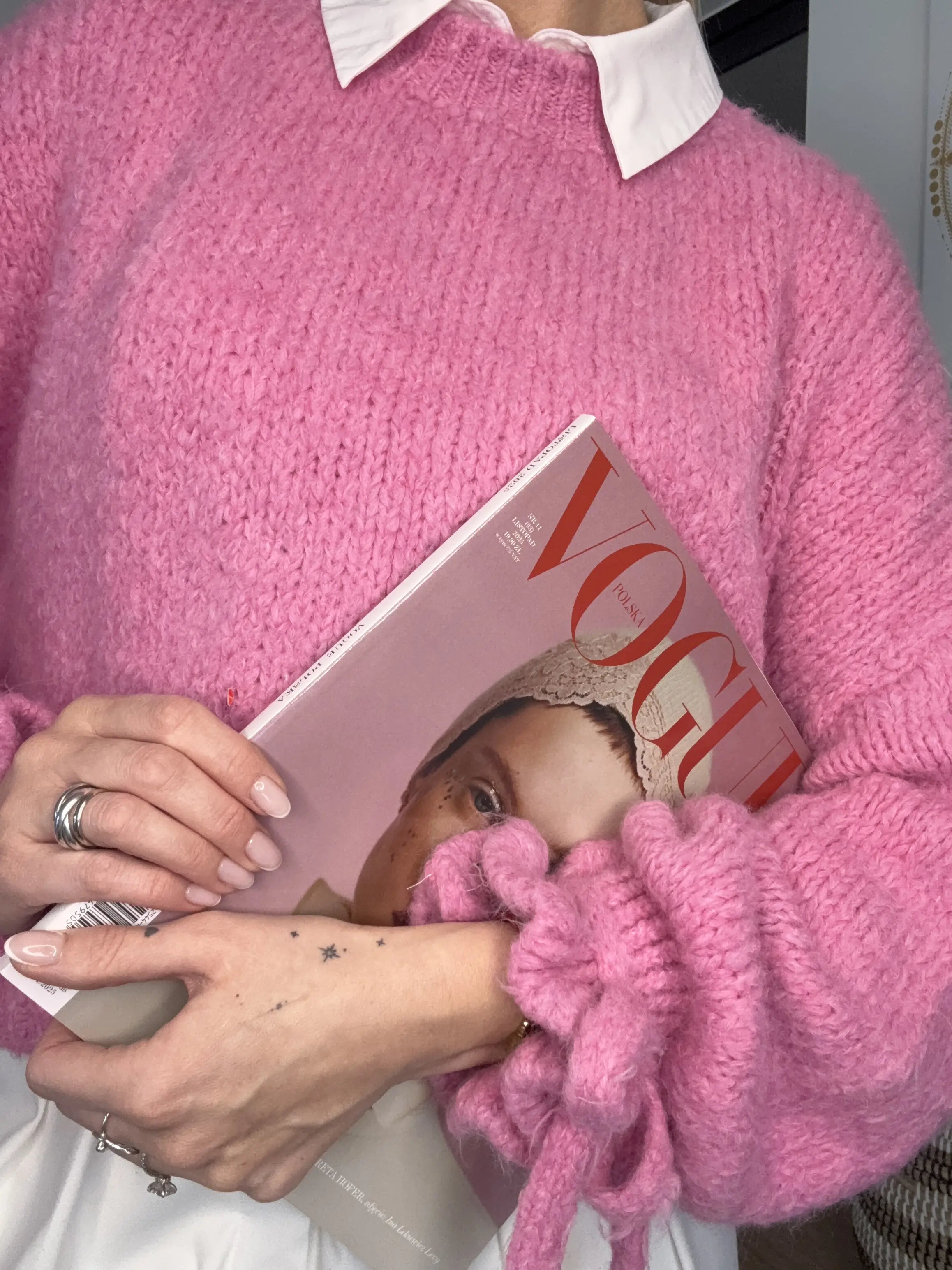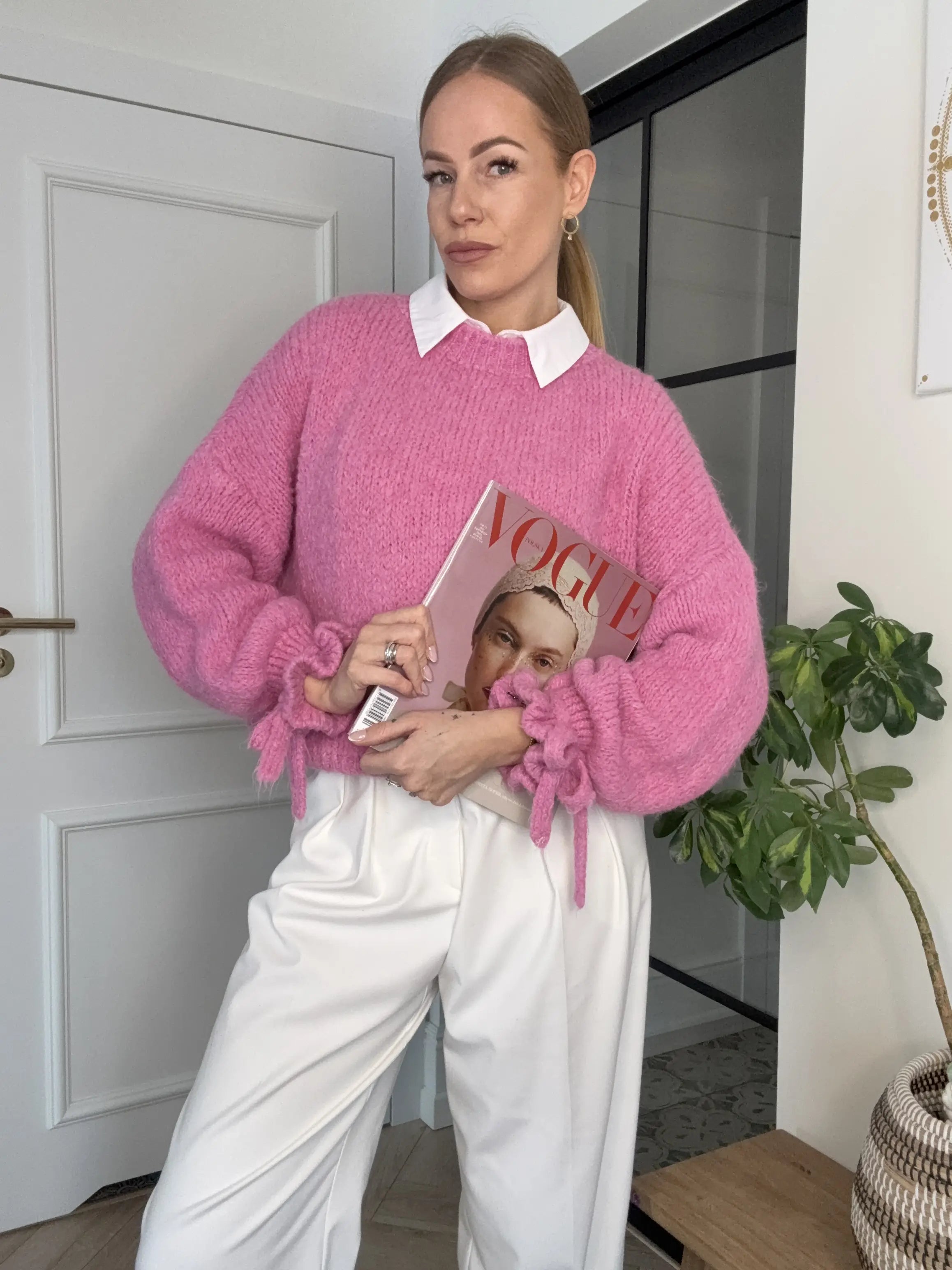 Stylowy damski sweter o modnym, luźnym kroju, wykonany z miękkiej i przyjemnej w dotyku dzianiny. Model wyróżnia się efektownymi, lekko bufiastymi rękawami zakończonymi delikatnym ściągaczem z kokardą, które nadają całości kobiecego i nowoczesnego charakteru. Doskonale sprawdzi się zarówno w codziennych zestawach z jeansami, jak i w bardziej eleganckich stylizacjach.