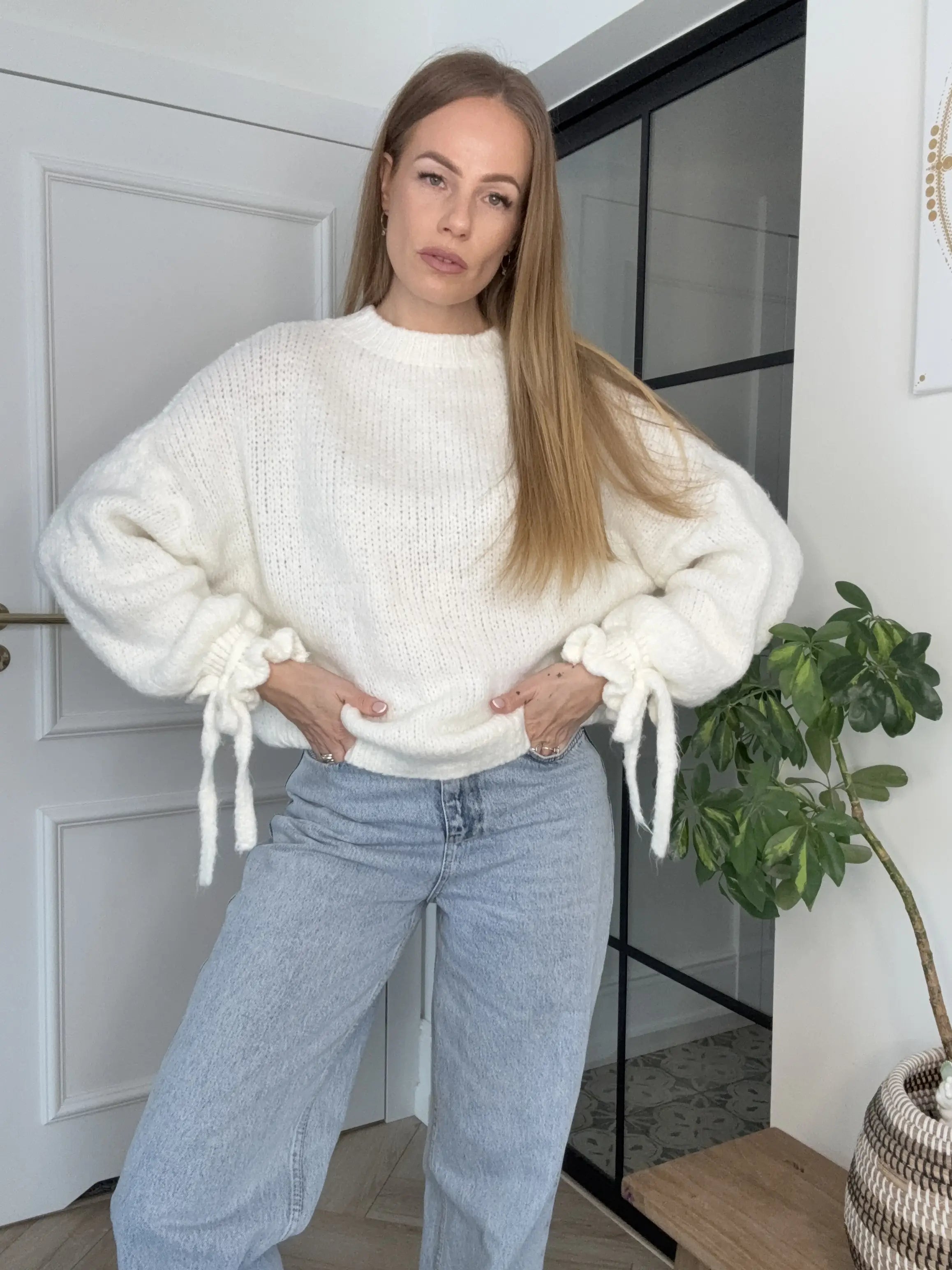 Stylowy damski sweter o modnym, luźnym kroju, wykonany z miękkiej i przyjemnej w dotyku dzianiny. Model wyróżnia się efektownymi, lekko bufiastymi rękawami zakończonymi delikatnym ściągaczem z kokardą, które nadają całości kobiecego i nowoczesnego charakteru. Doskonale sprawdzi się zarówno w codziennych zestawach z jeansami, jak i w bardziej eleganckich stylizacjach.
