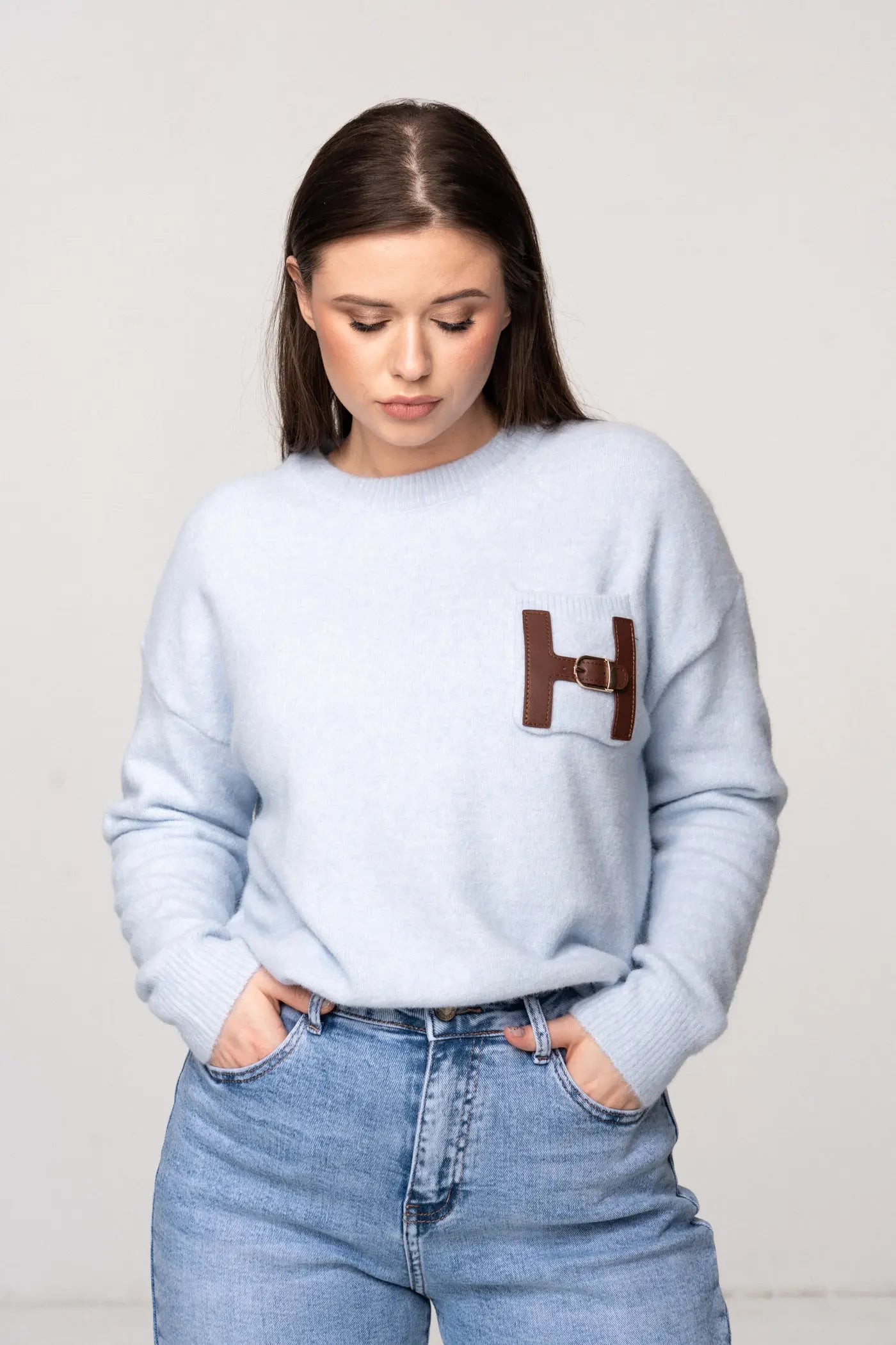 Stylowy sweter Hermis z kieszonką na piersi, który łączy w sobie funkcjonalność i modny design. Wyróżnia go oryginalny detal w postaci skórzanej naszywki w kształcie litery „H”, dodającej całości elegancji i unikalnego charakteru.