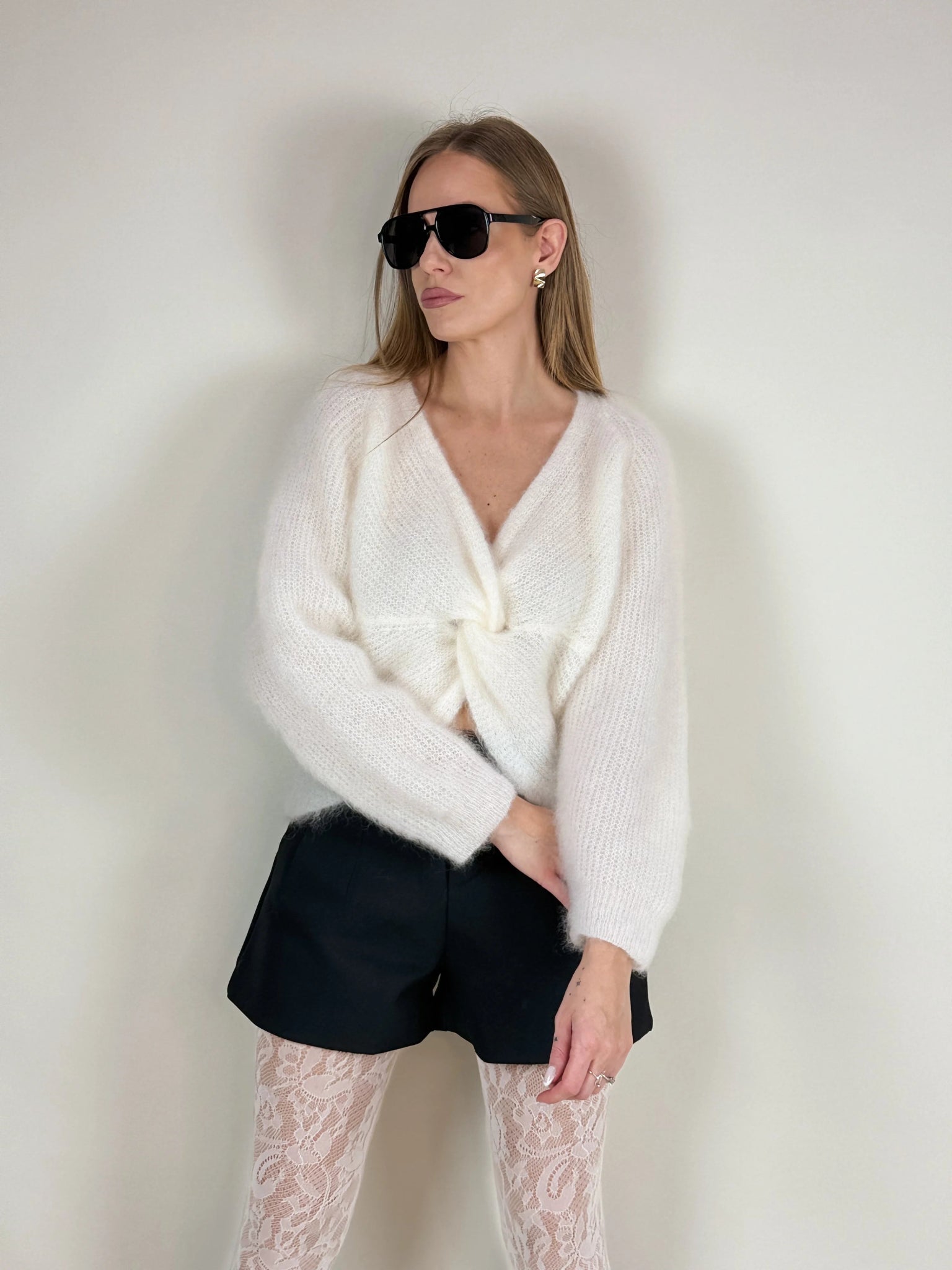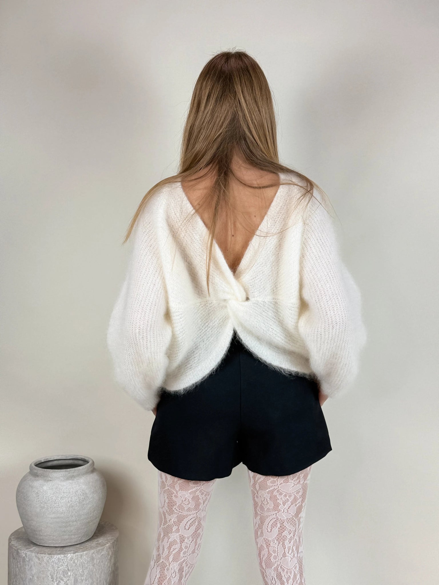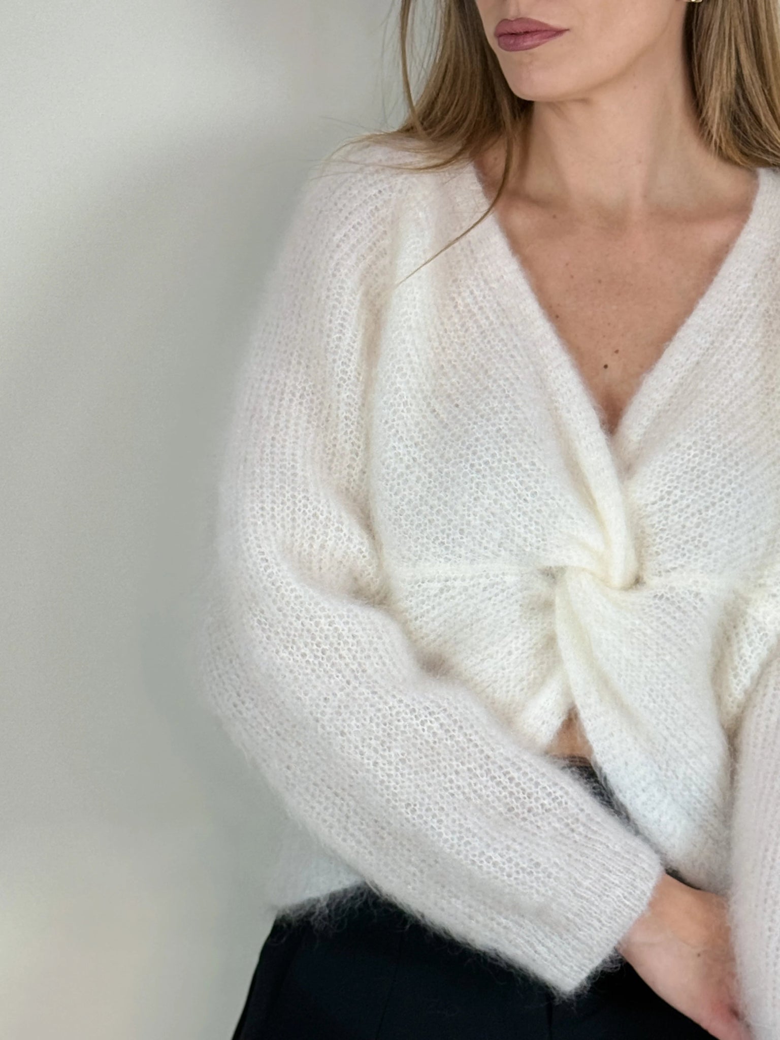 Wykonany z luksusowej przędzy z zawartością 74% moheru, otula ciało miękkością i zapewnia przyjemne ciepło w chłodniejsze dni. Klasyczny krój z długim rękawem i subtelnym ściągaczem dopełnia efektowny dekolt z wiązaniem, który można nosić na dwa sposoby – z przodu lub z tyłu, w zależności od okazji.