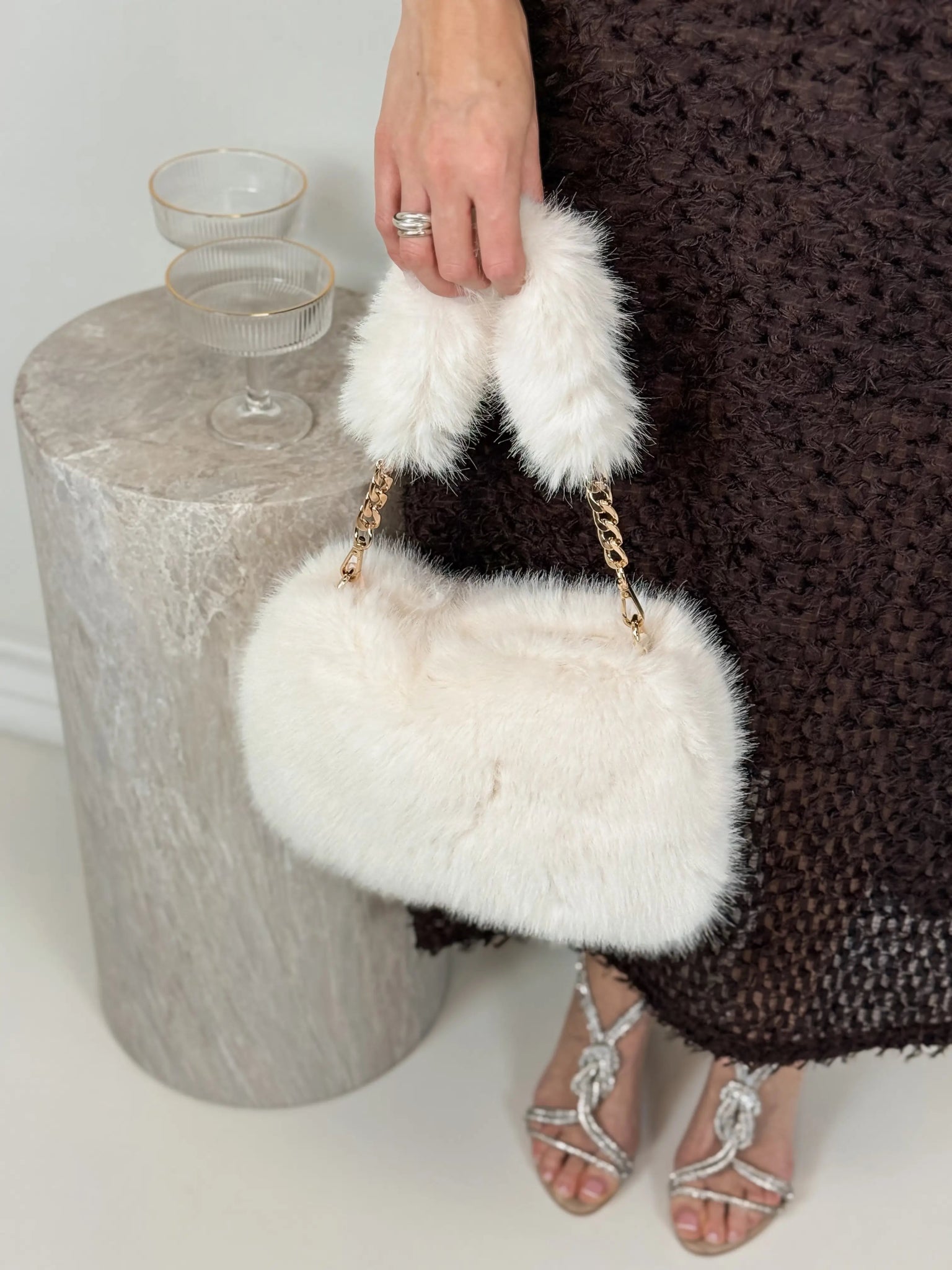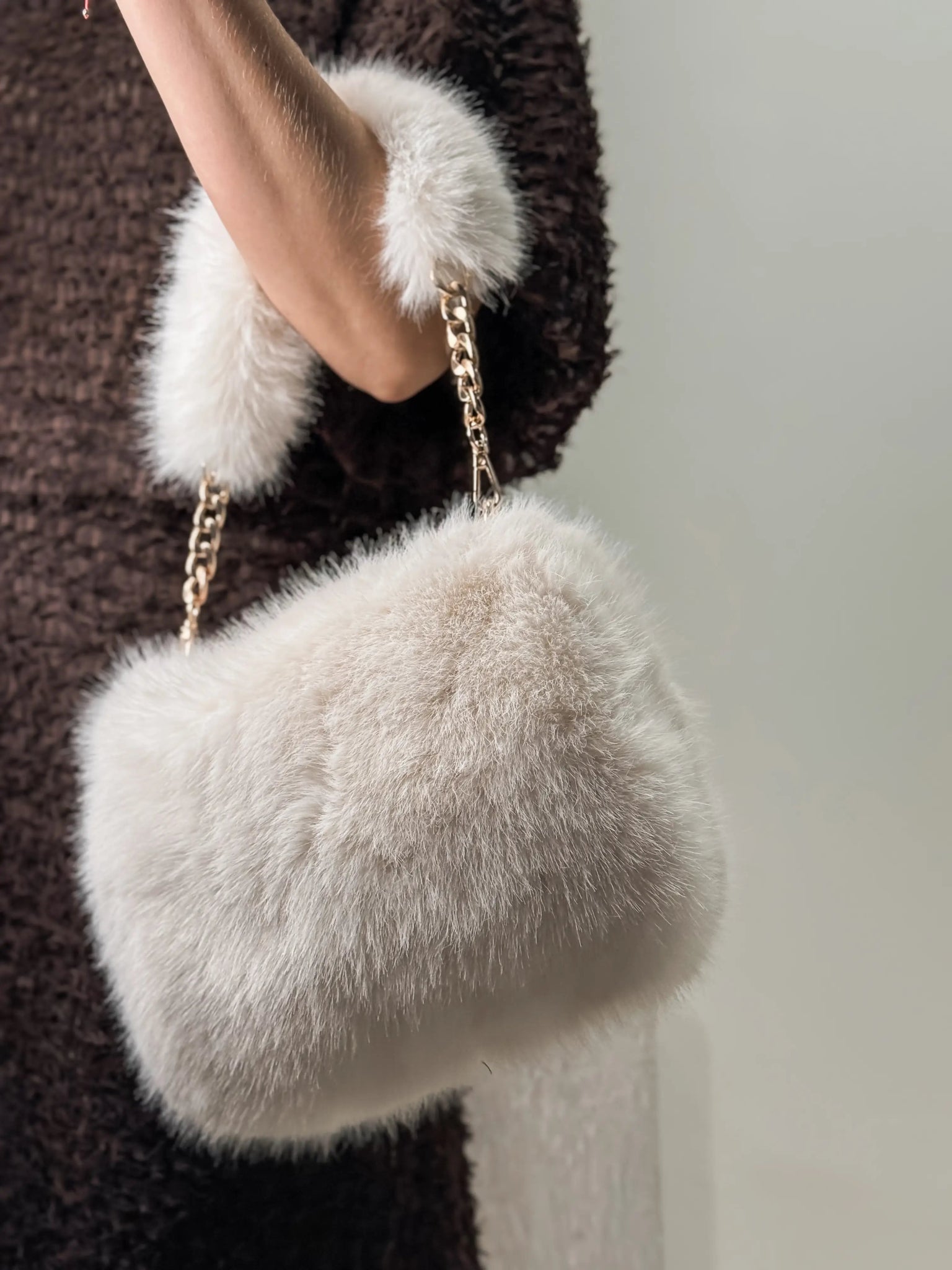 Torebka Furry wykonana w eleganckim odcieniu ecru, który znakomicie komponuje się ze stonowanymi oraz wyrazistymi stylizacjami. Materiał zewnętrzny to miękkie futro o puszystej strukturze. Do zestawu dołączony jest długi łańcuszek w kolorze złota oraz krótki łańcuszek z futrzanym zakończeniem do trzymania w ręce.